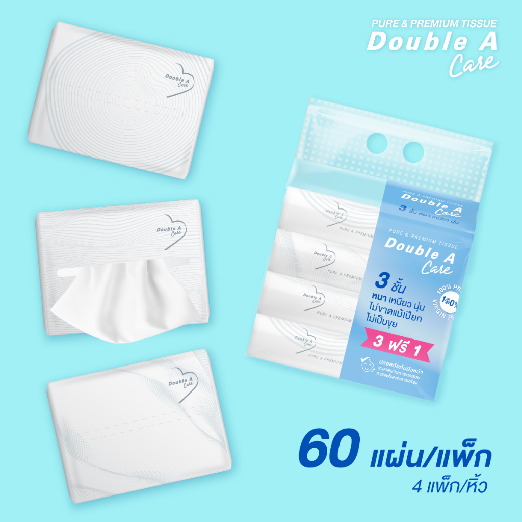 [Travel logo] Double A Care เพียว & พรีเมียมทิชชู หนา 3 ชั้น Travel pack 60 แผ่น/ชิ้น (แพ็ก 4 ห่อ) 1 แพ็ก