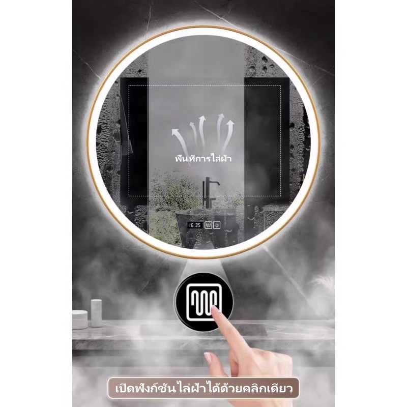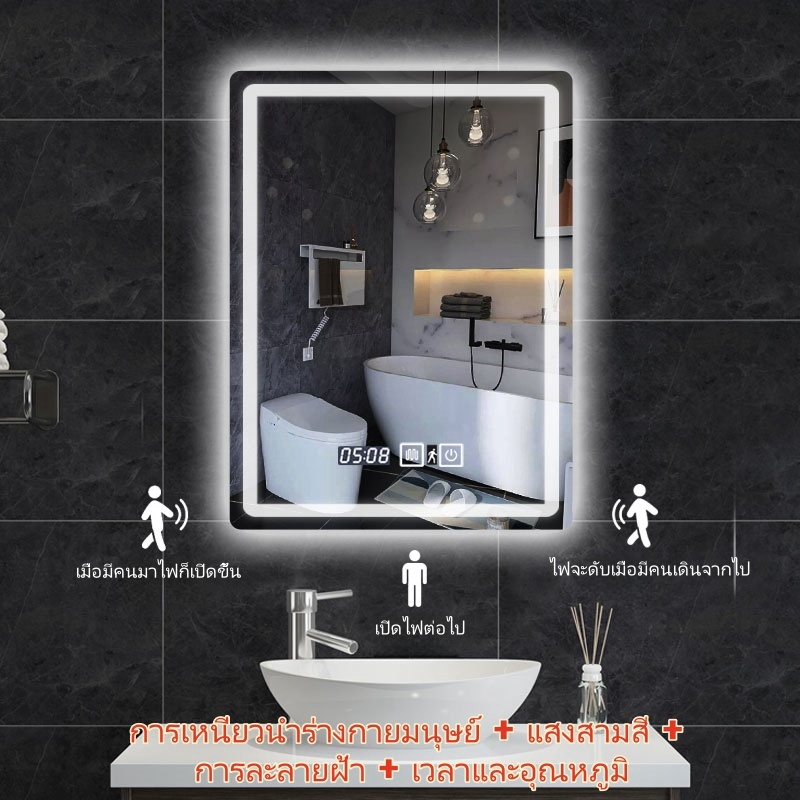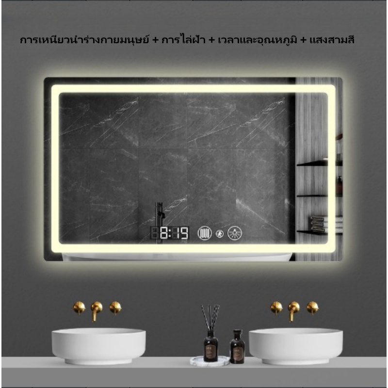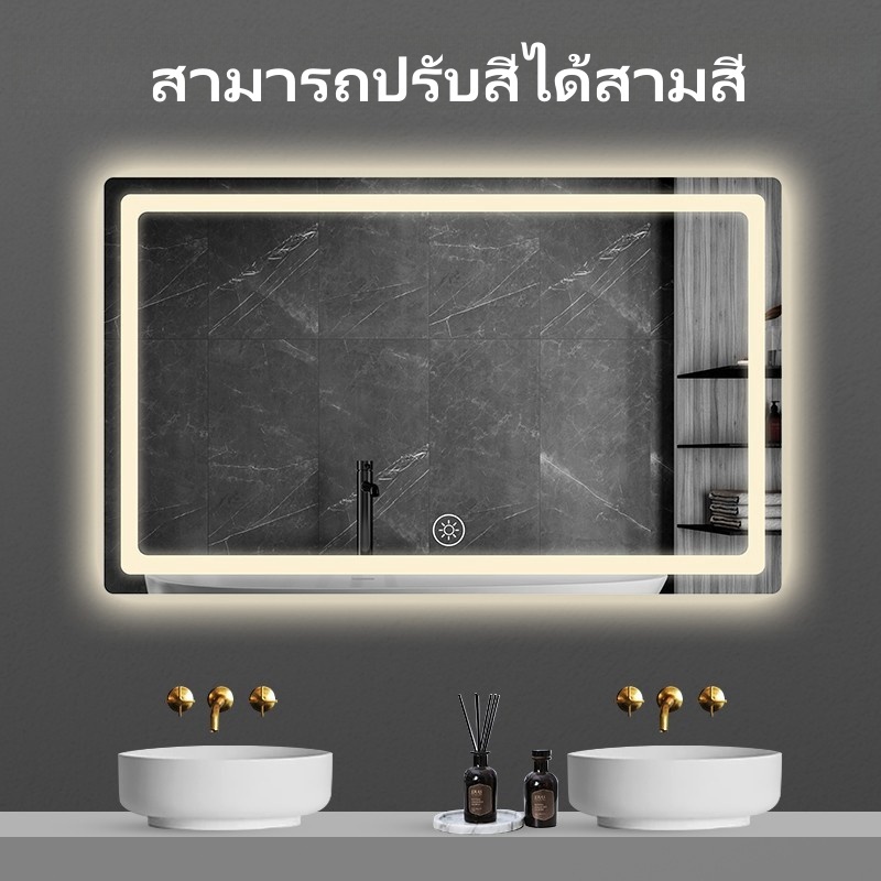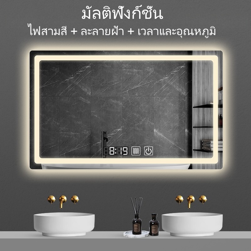 กระจกห้องน้ำอัจฉริยะ LED ควบคุมด้วยการสัมผัส ไฟ สามสี ฟังก์ชันล้างหมอก แสดงเวลาและอุณหภูมิ ขนาดซม70*90/100*75/120*75ซม