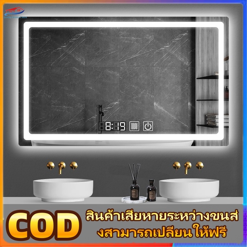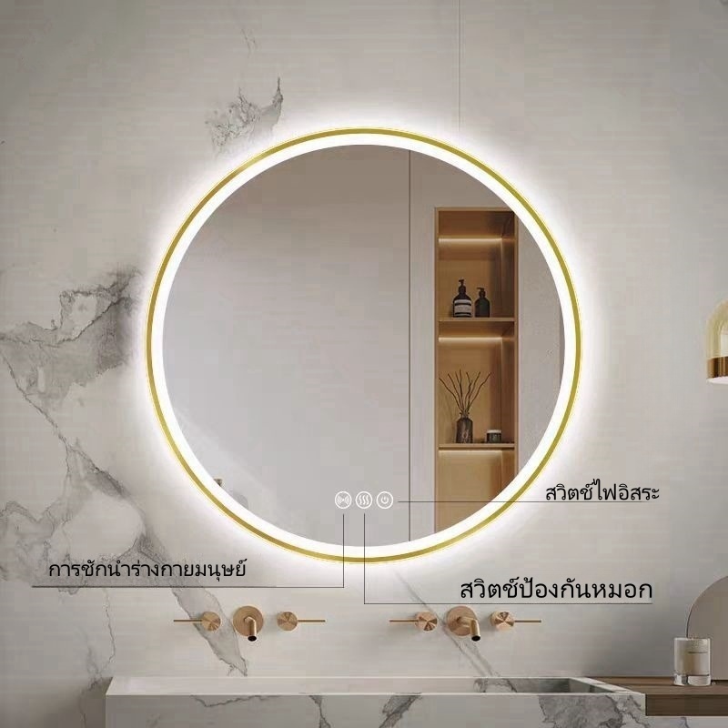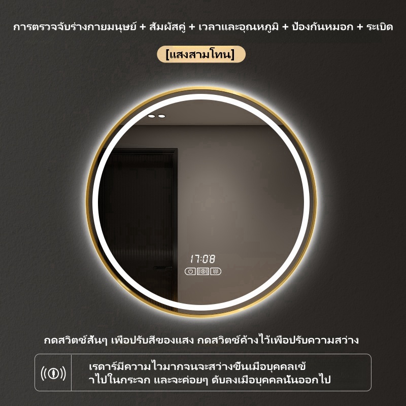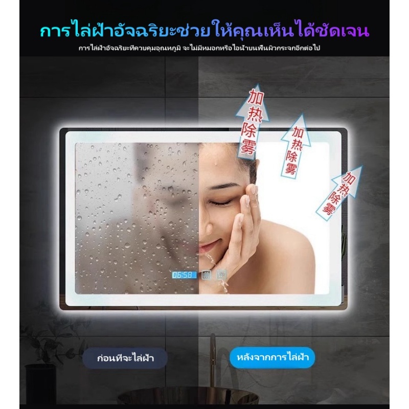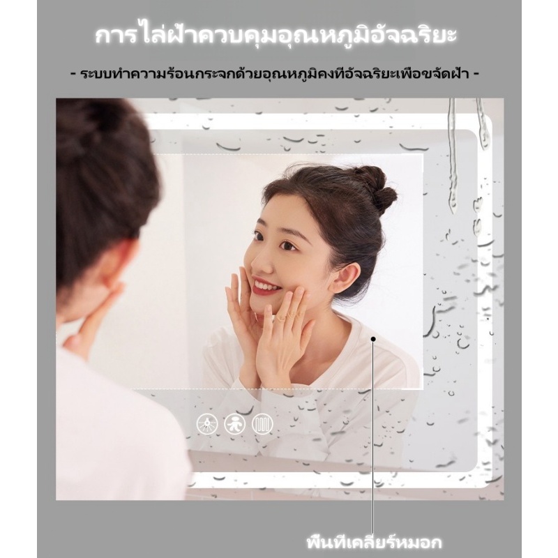 กระจกห้องน้ำอัจฉริยะ LED ควบคุมด้วยการสัมผัส ไฟ สามสี ฟังก์ชันล้างหมอก แสดงเวลาและอุณหภูมิ ขนาดซม70*90/100*75/120*75ซม