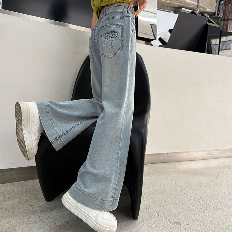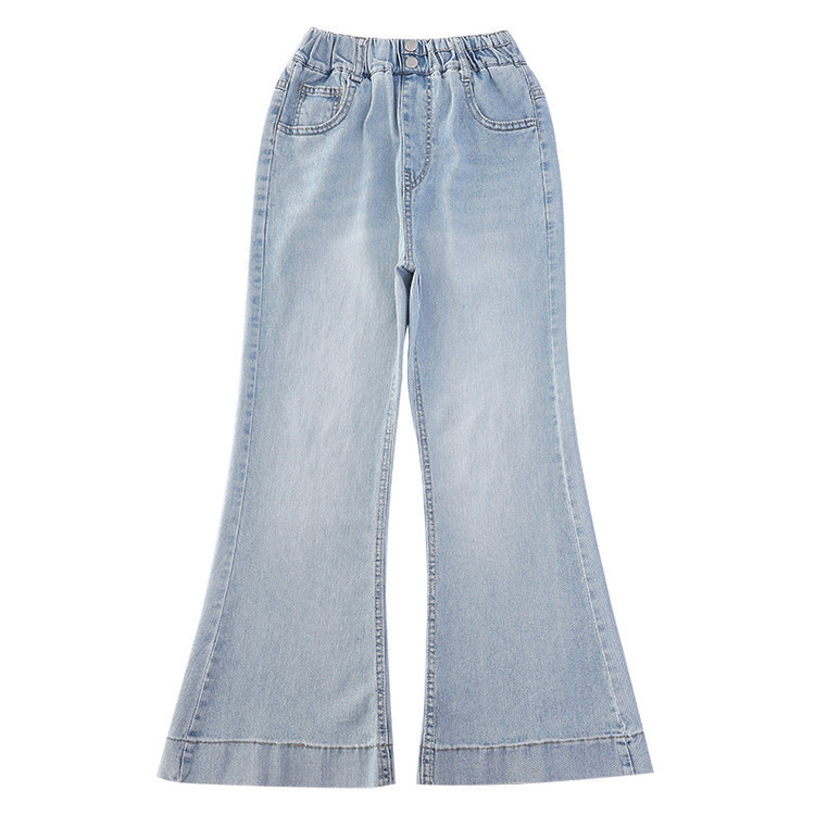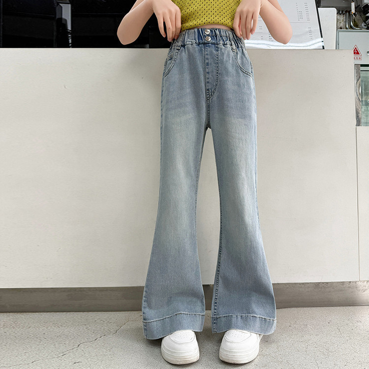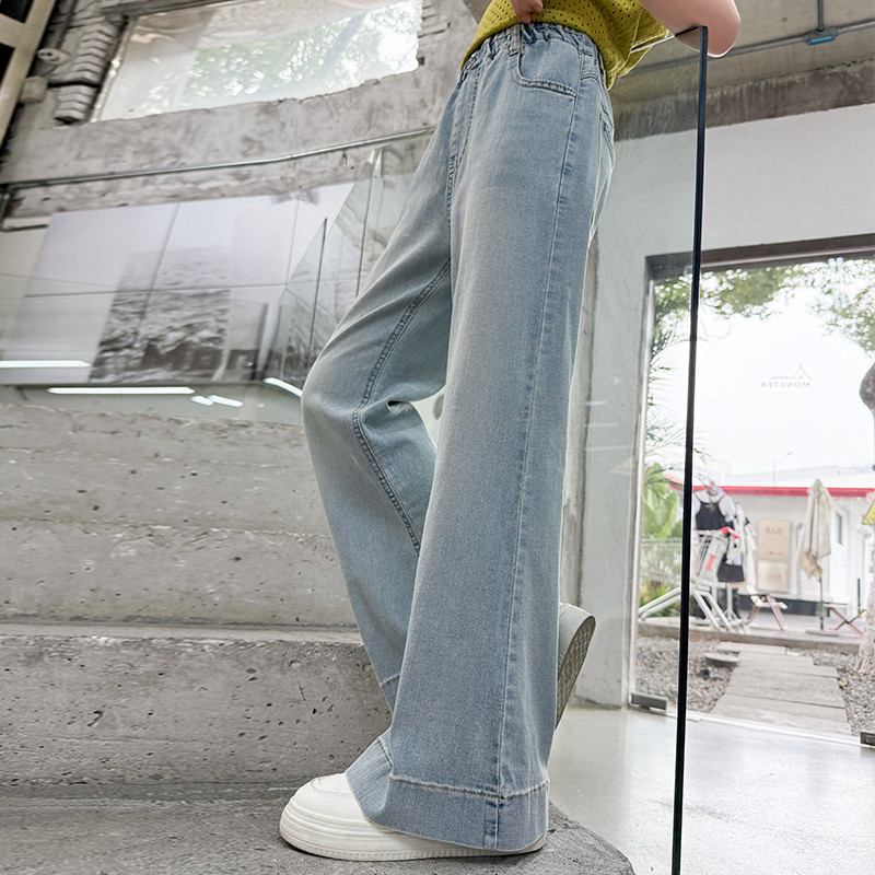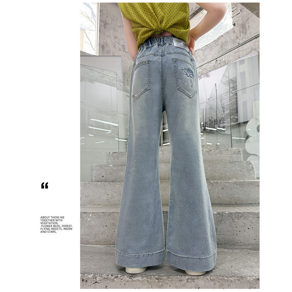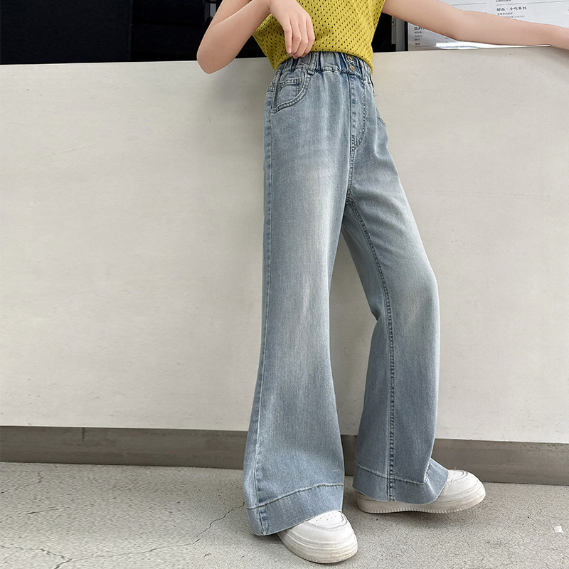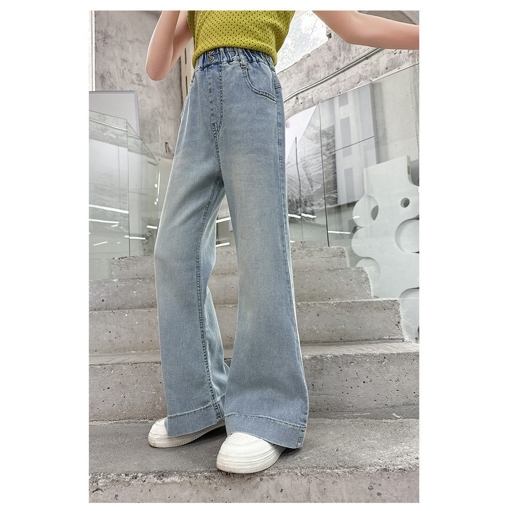 2025 กางเกงยีนส์เด็กผู้หญิงแบบบาง กางเกงขาบานยืดหยุ่น Tencel สไตล์เด็ก กางเกงขากว้าง