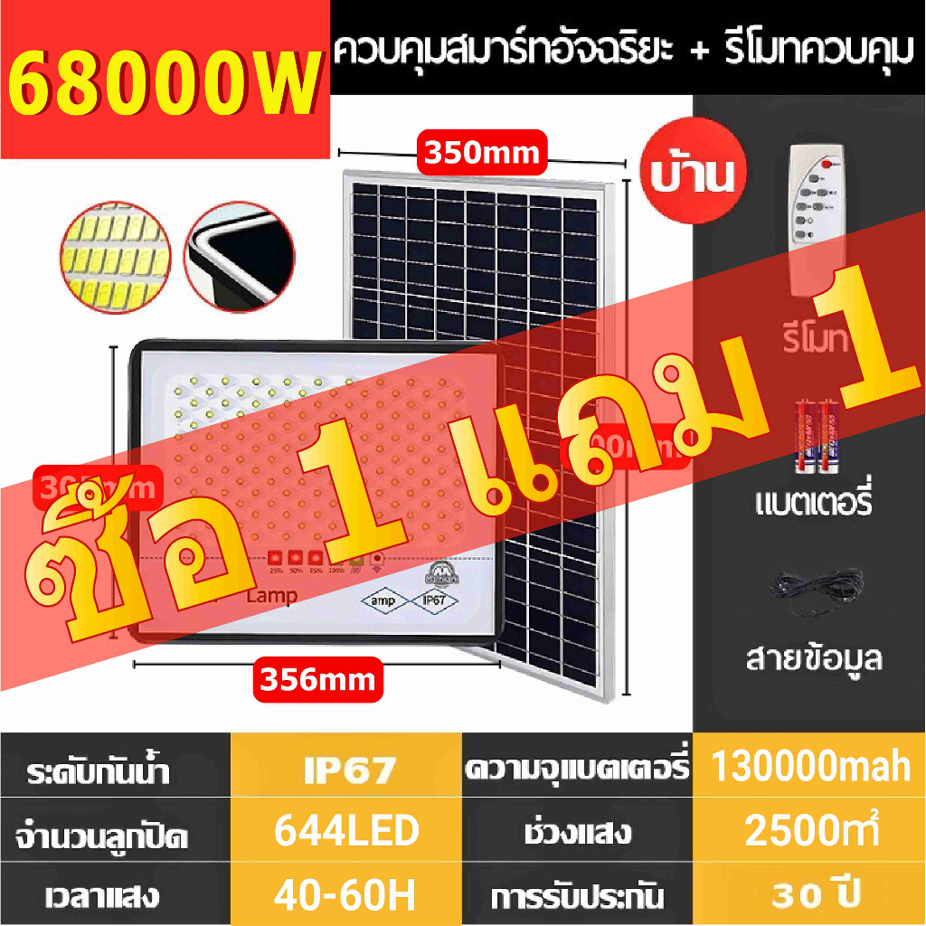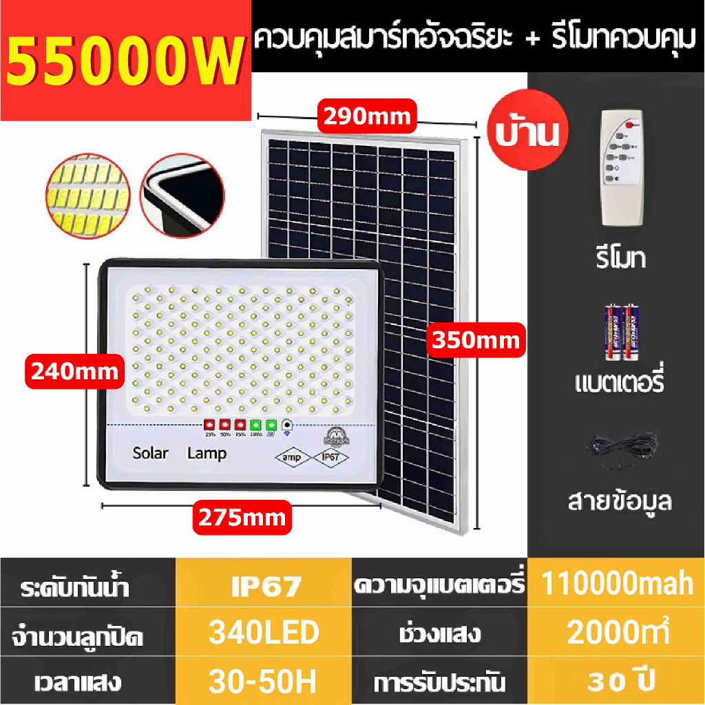 【รับประกัน30ปี】ไฟโซล่าเซลล์ 55000W ซื้อ 1 แถม 1ไฟสปอตไลท์ จับเวลาระยะไกล ชาร์จไฟตอนกลางวัน สว่างเมื่อฟ้ามืด