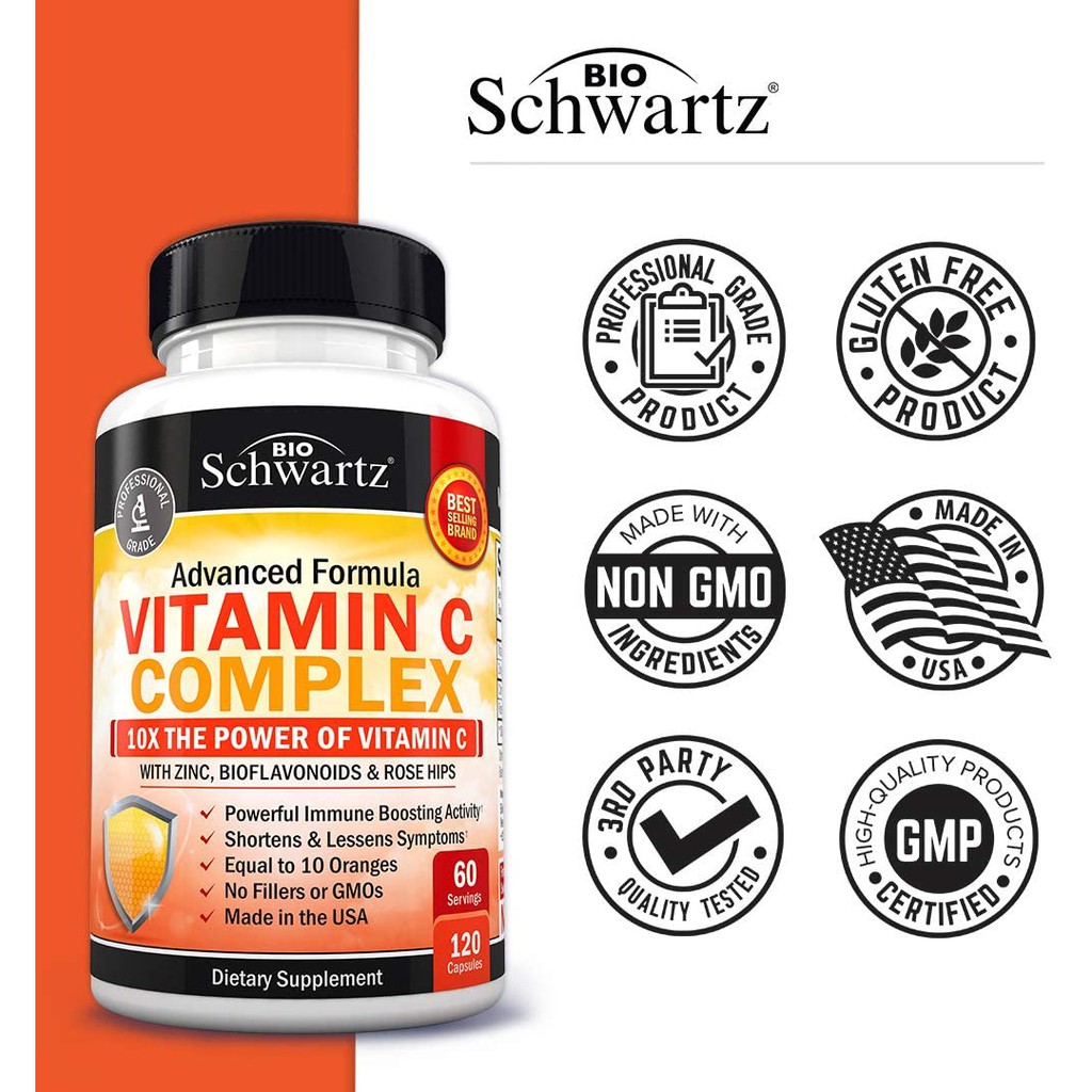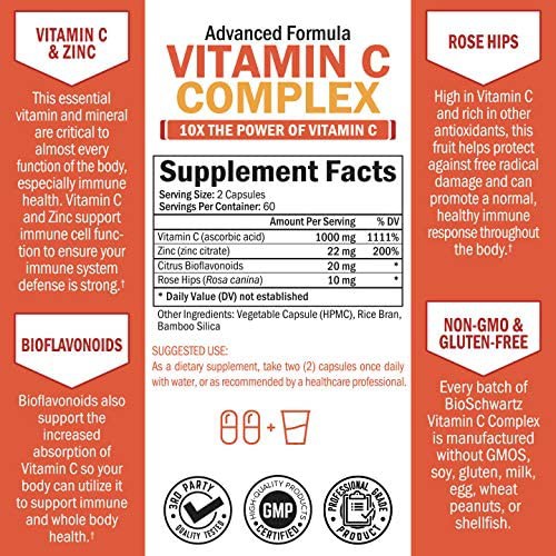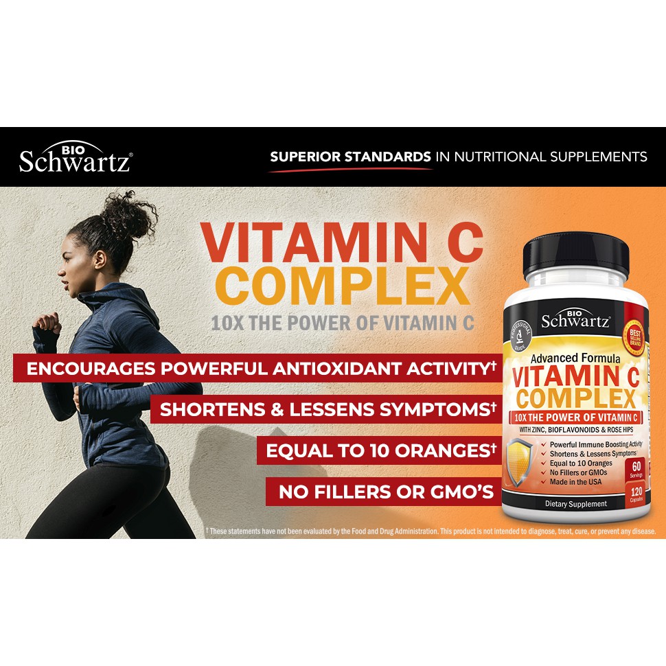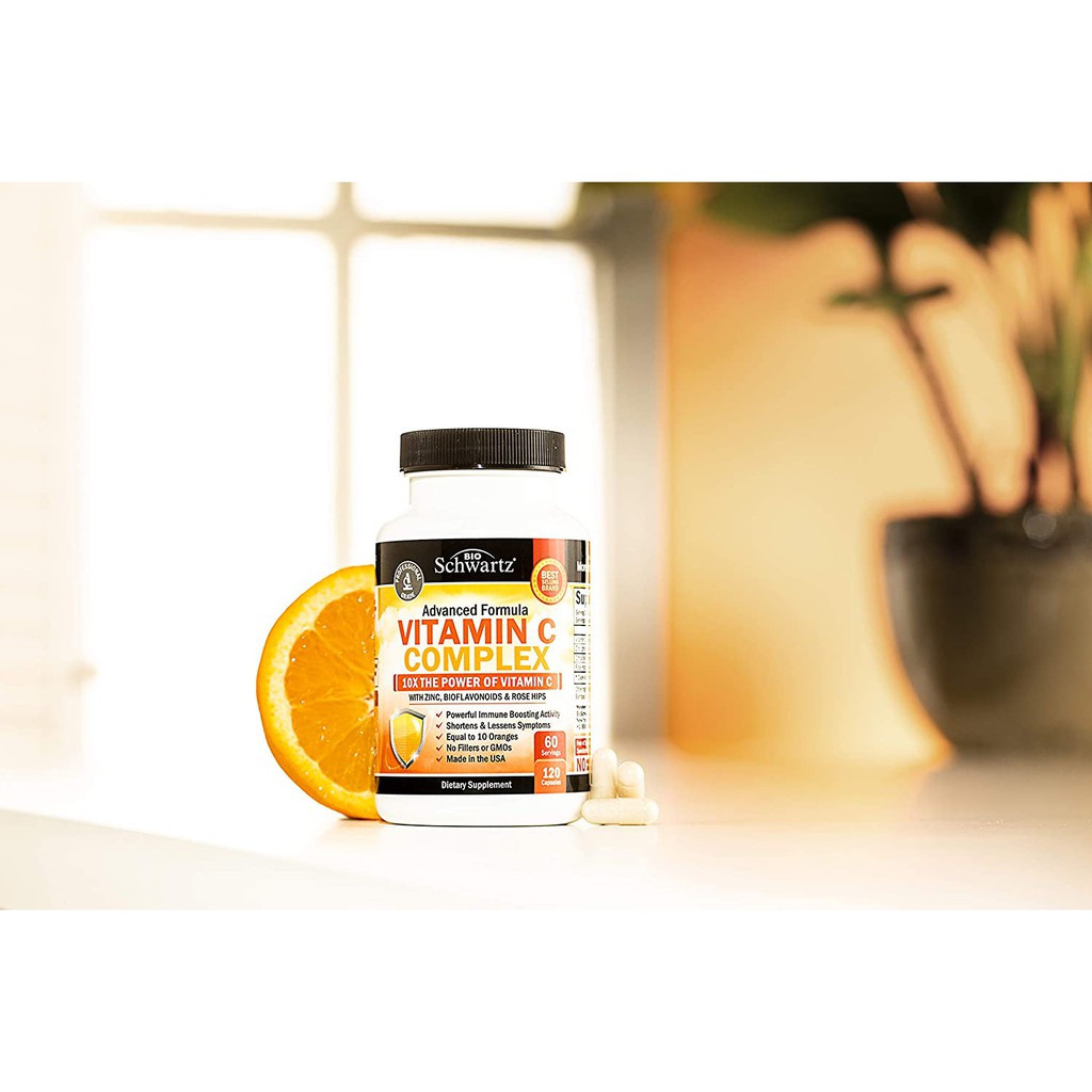 BioSchwartz,USA วิตามินซีสูตรเข้มข้น 1000mg Vitamin C Complex with Zinc, Rose Hips Bioflavonoids ดูดซึมได้ยาวนาน 8-10 ชม