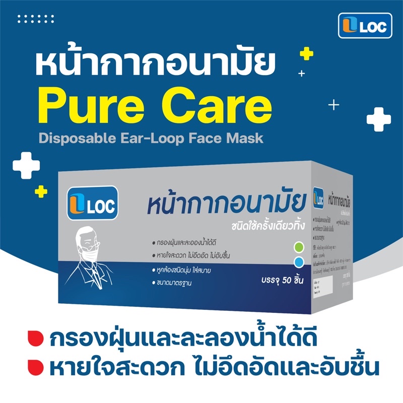 หน้ากากอนามัย LOC Pure Care (สายคล้องหูกลม) หนาพิเศษ 3ชั้น เกรดคุณภาพดี ไม่บาง ประสิทธิภาพการกรองมากกว่า 98%