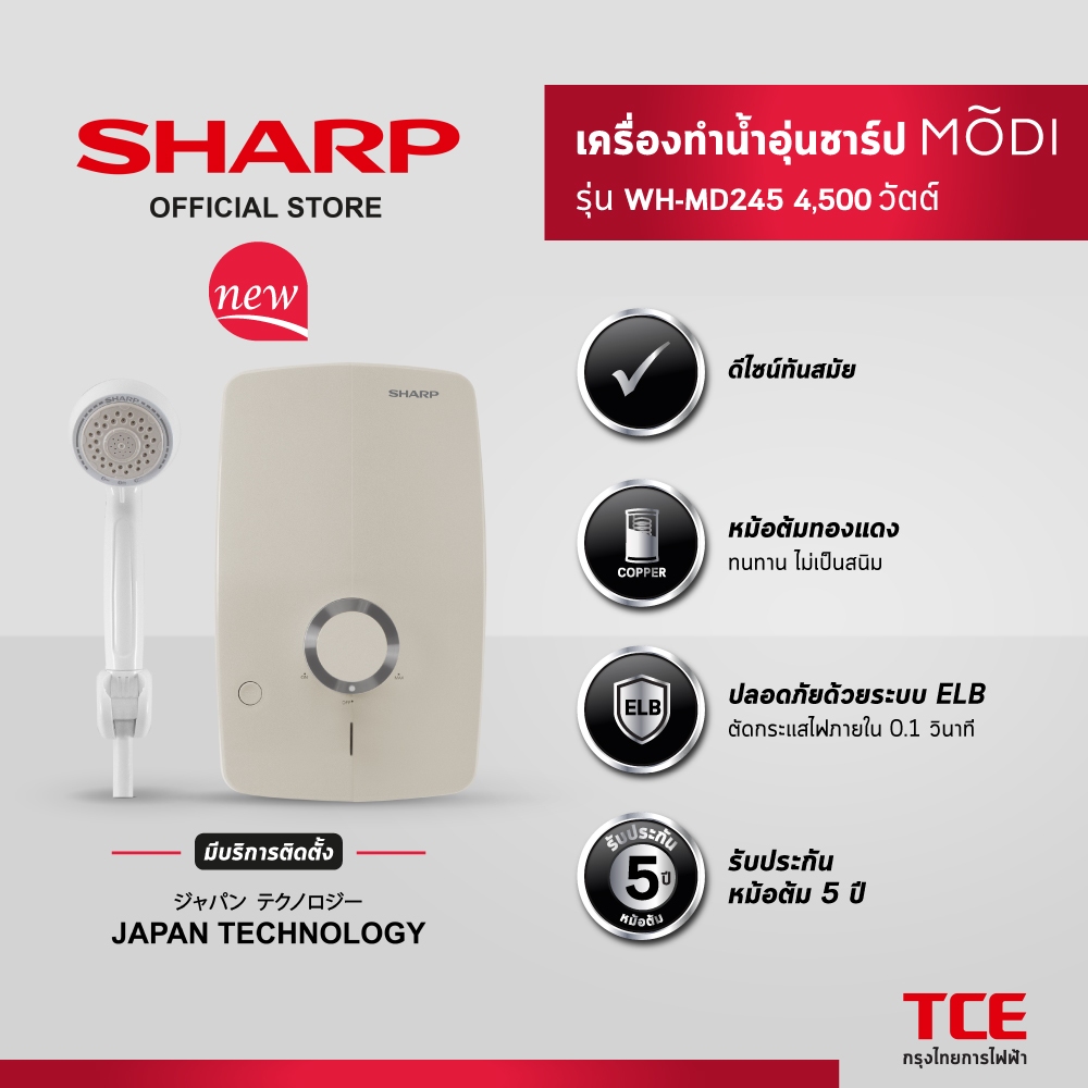 [มีบริการติดตั้ง] SHARP เครื่องทำน้ำอุ่นชาร์ป MODI รุ่น WH-MD245 4,500 วัตต์