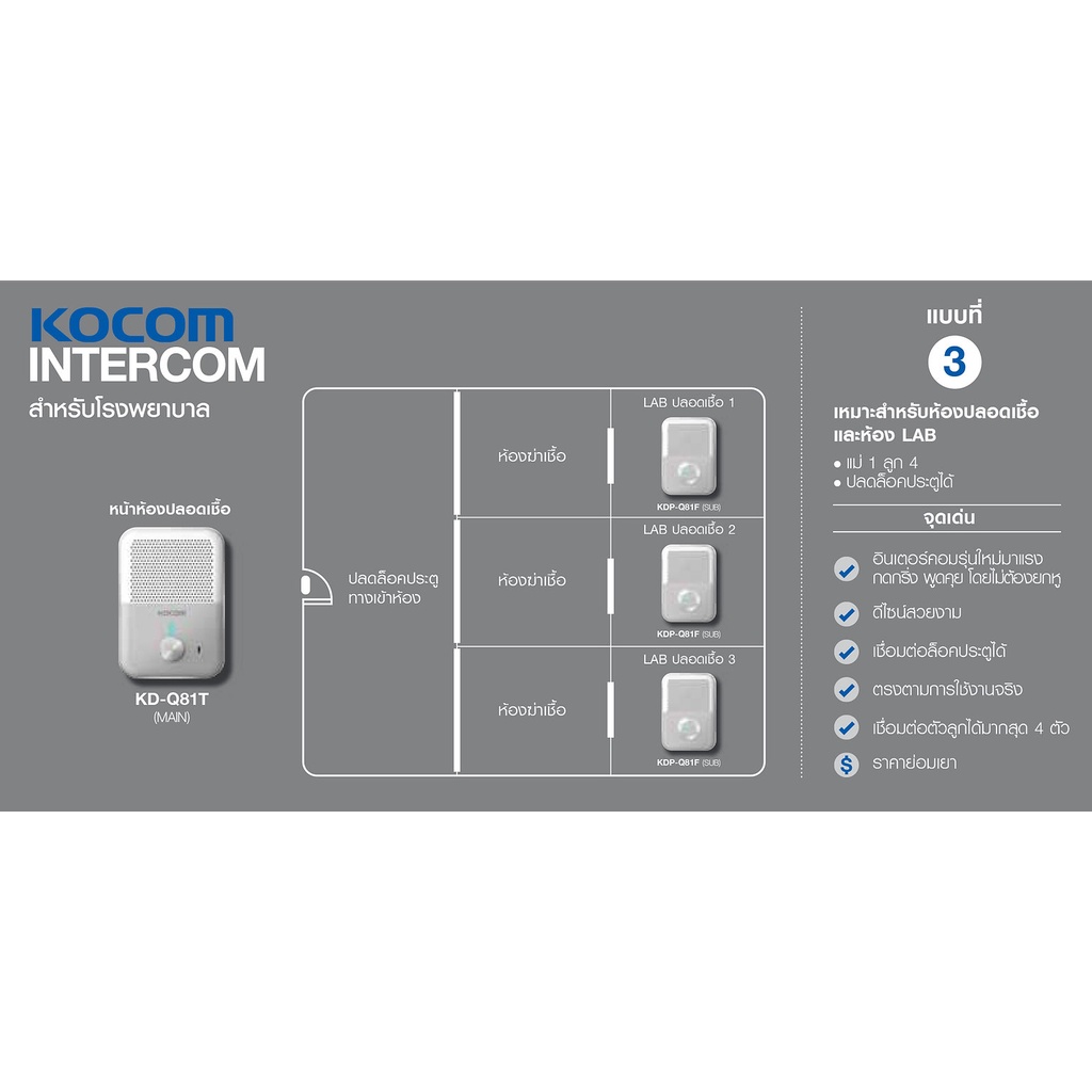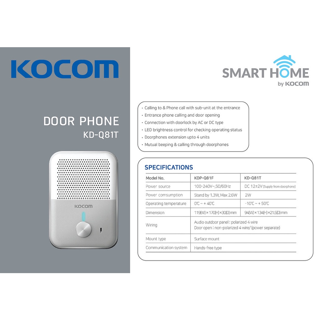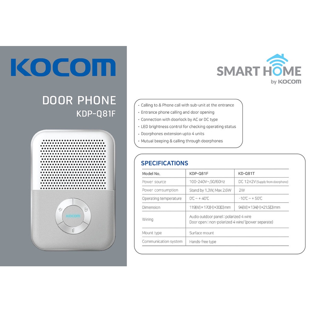 KOCOM DOOR PHONE แบบ Handfree รุ่น KDP-Q81F + KD-Q81T