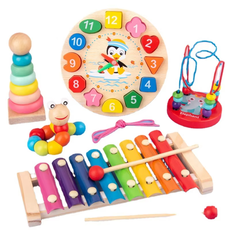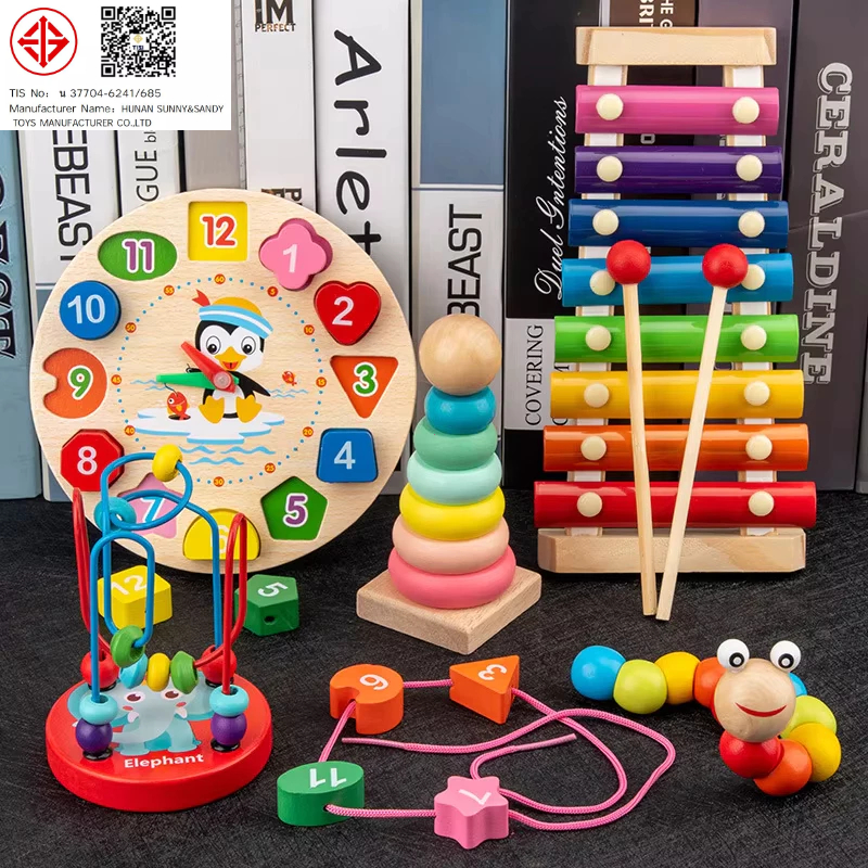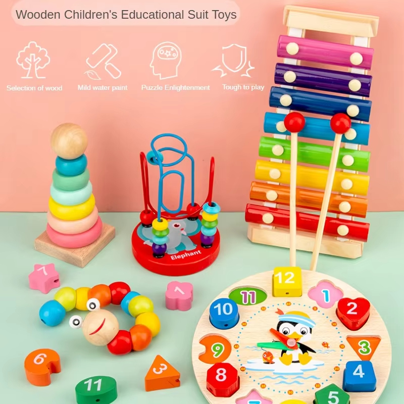 ของเล่นไม้เสริมพัฒนาการ บล๊อคไม้เลขาคณิต ของเล่นไม้ เสริมพัฒนาการ ตัวต่อรูปทรง ห่วงไม้สีรุ้งสวมหลัก