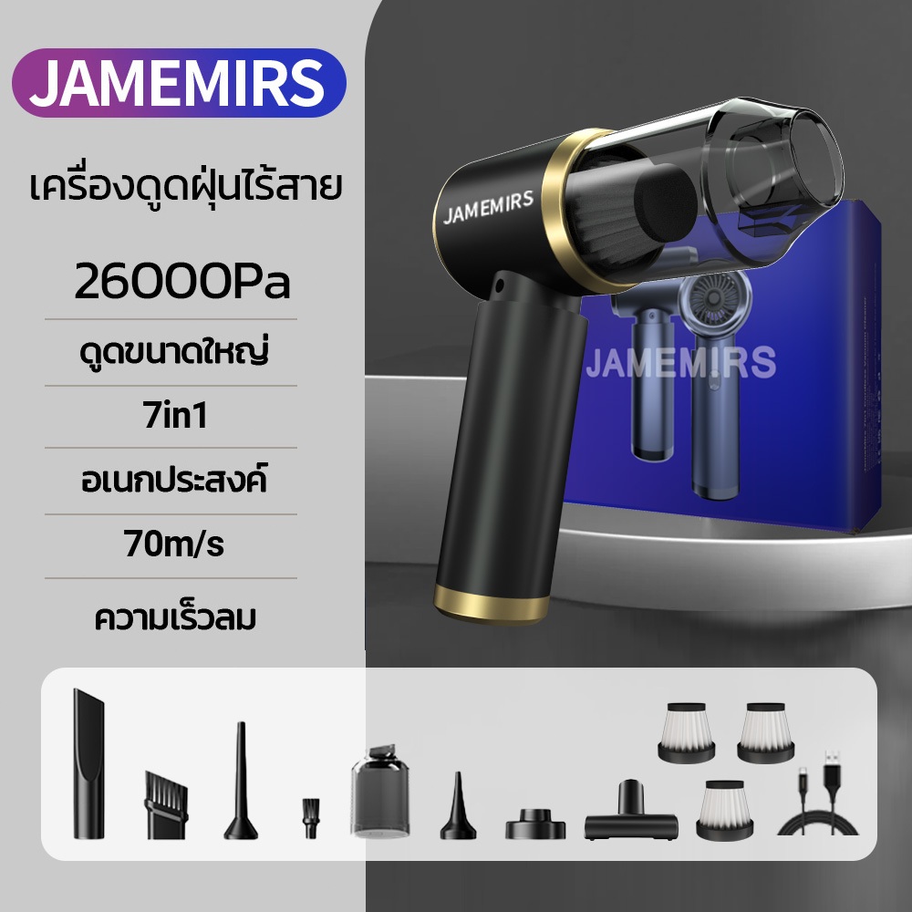 JameMirs26000Pa เครื่องดูดฝุ่นเล็กไร้สาย 7in1 ที่ดูดฝุ่นมือถือ ดูดฝุ่นในรถยนต์พกพา Car Vacuum Cleaner ใช้ได้ในบ้าน ที่รถ
