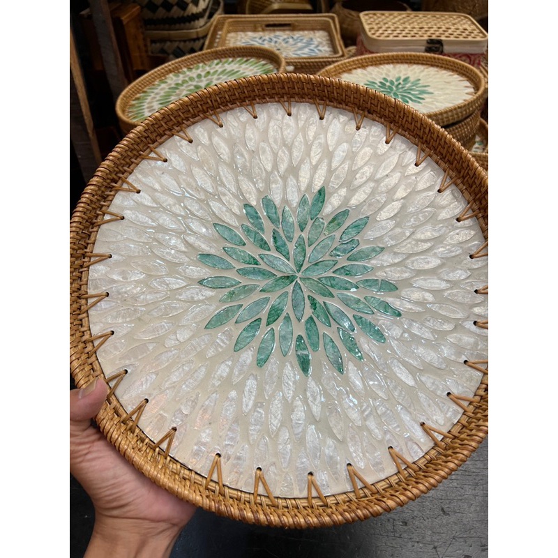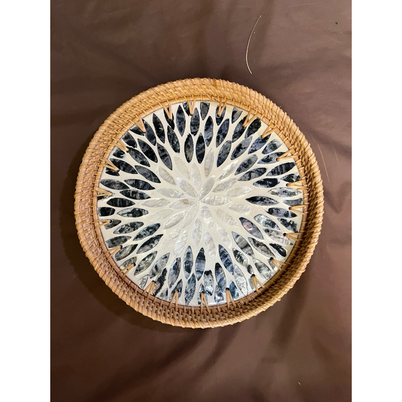 ถาดหวาย ฝังมุก ลายเปลือกหอย ใส่ขนมปัง เสริฟอาหาร รองชุดชา กาแฟ