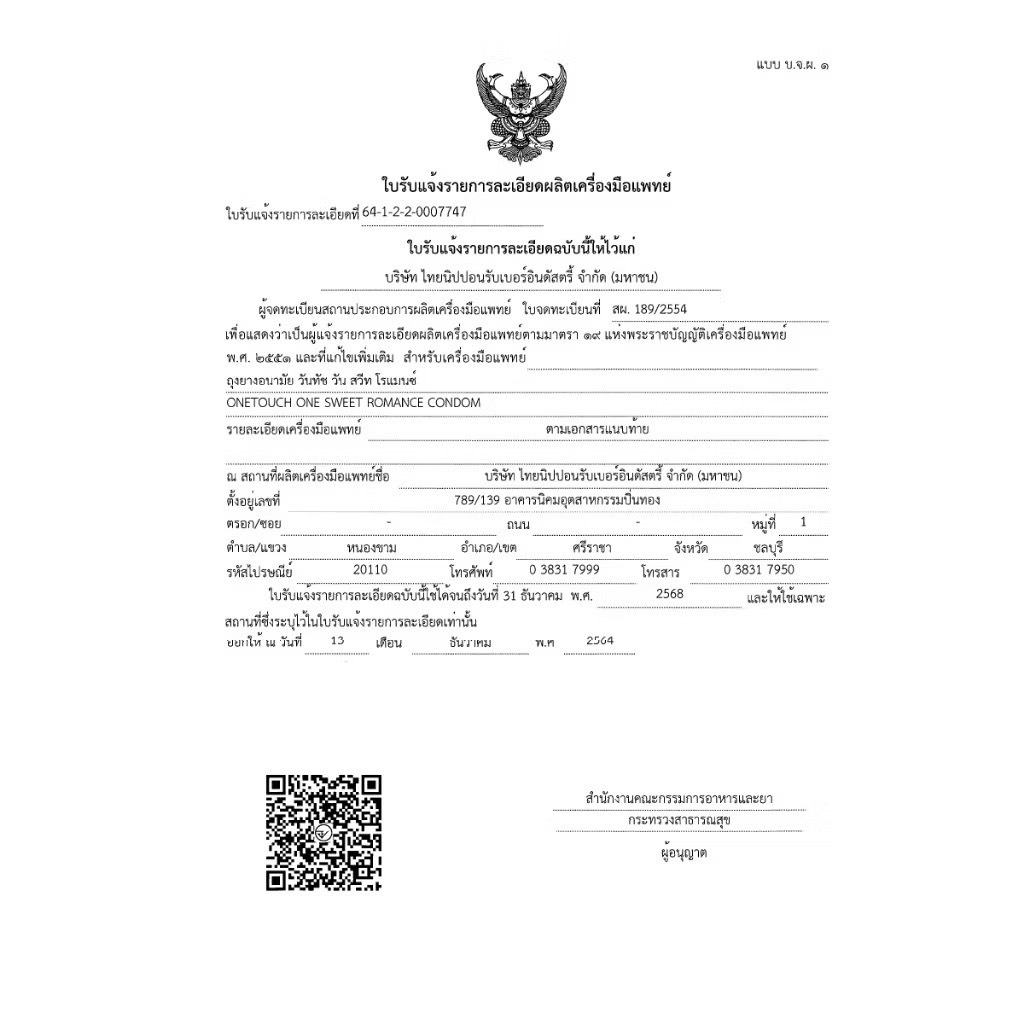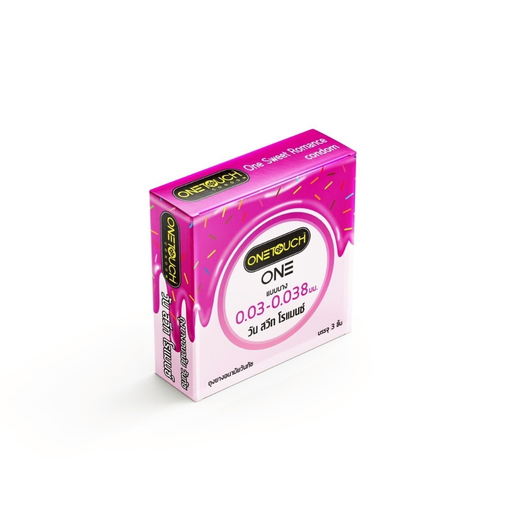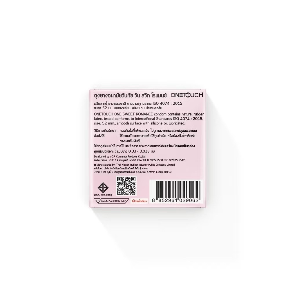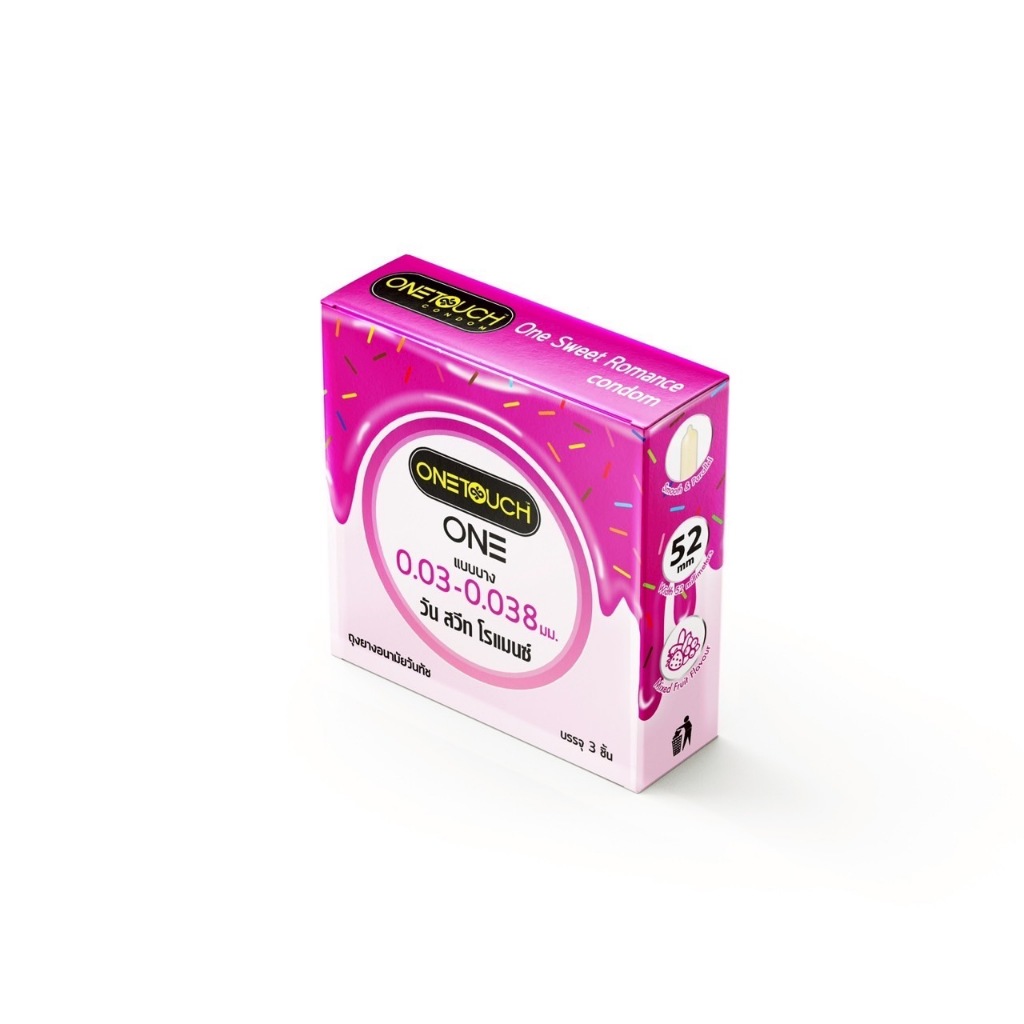 Onetouch ONE Sweet Romance Condom ++กล่องเล็ก++ถุงยางอนามัยวันทัช วันสวีท โรแมนซ์ ผิวเรียบบาง0.03 ขนาด52มม. บรรจุ 3ชิ้น