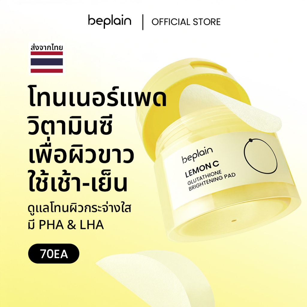 Beplain เลม่อน โทนเนอร์แพด ซีกลูตาไธโอน ไบรท์เทนนิ่ง 70แผ่น | ช่วยปรับสีผิวให้ดูกระจ่างใสขึ้น | มีส่วนผสมของ PHA&LHA ช่วยให้ผิวเรีย บเนียนขึ้น | LEMON C GLUTATHIONE BRIGHTENING PAD