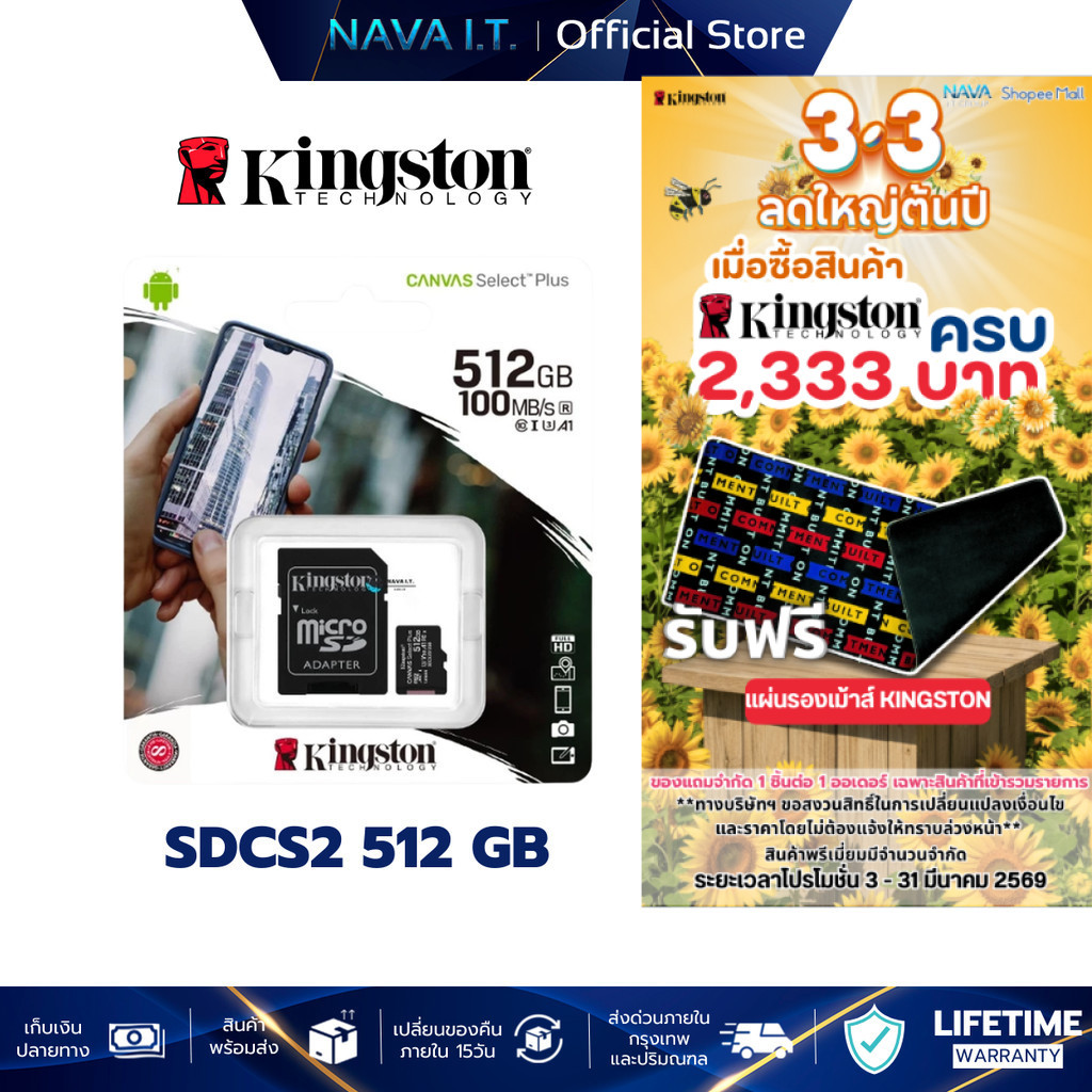 KINGSTON SDCS2/512GB ไมโครเอสดีการ์ด NEW CANVAS SELECT PLUS MICROSDXC CLASS 10 100MB/S MEMOR...