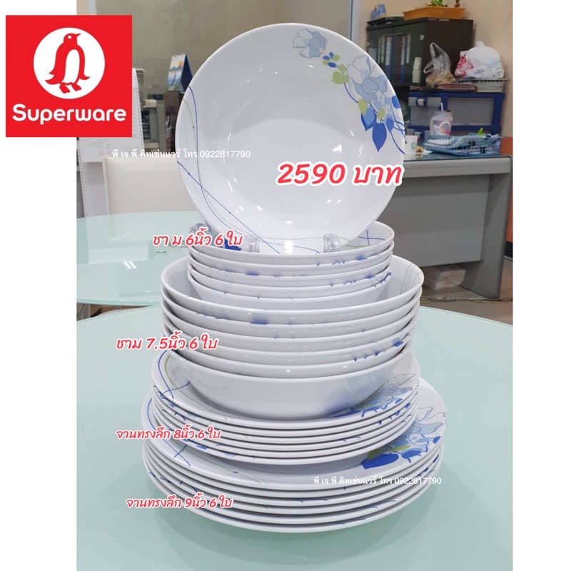 ซุปเปอร์แวร์ ชุด จานชาม ซุปเปอร์แวร์24ชิ้น ลายบลูมิงบลู ~จาน9นิ้ว~จาน8นิ้ว~ชาม7.5นิ้ว~ชาม6นิ้ว อย่างละ6ใบ
