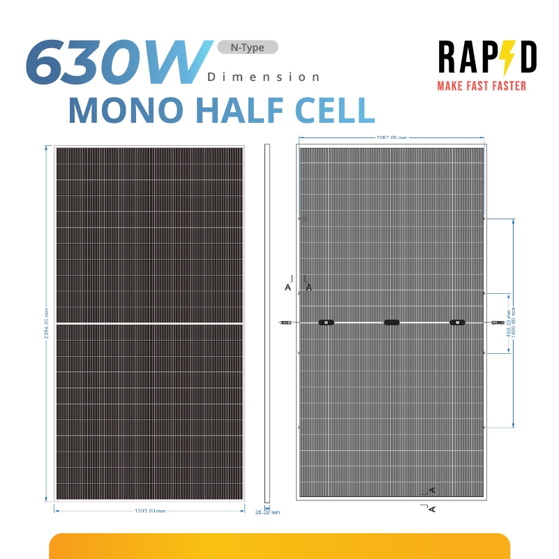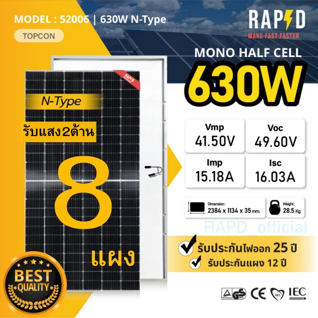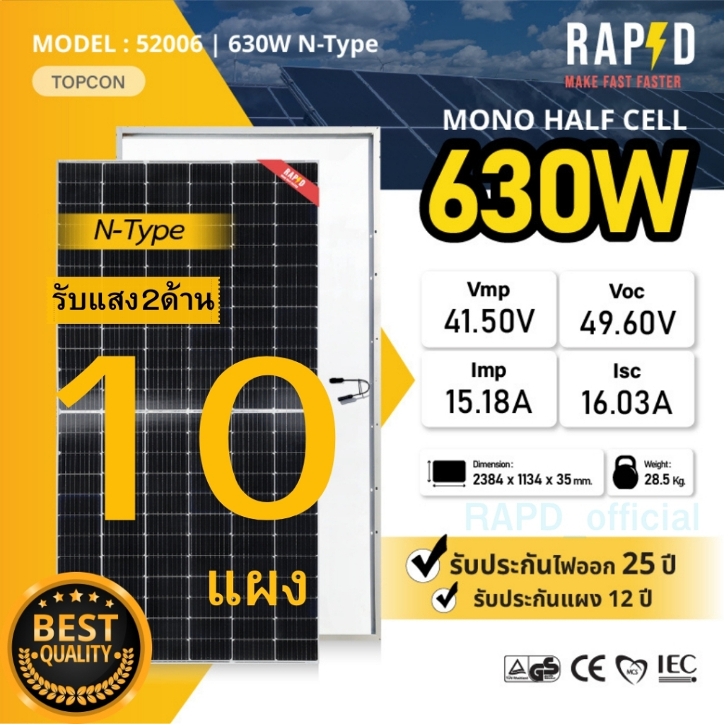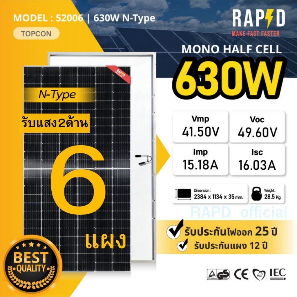 RAPD ส่งฟรี โดยร้านค้า - โปรชุด แผงโซล่าเซลล์ 630W หมด รอของ4พค Mono Half cell (ประกันแผง12ปีประกันไฟออก30ปี)