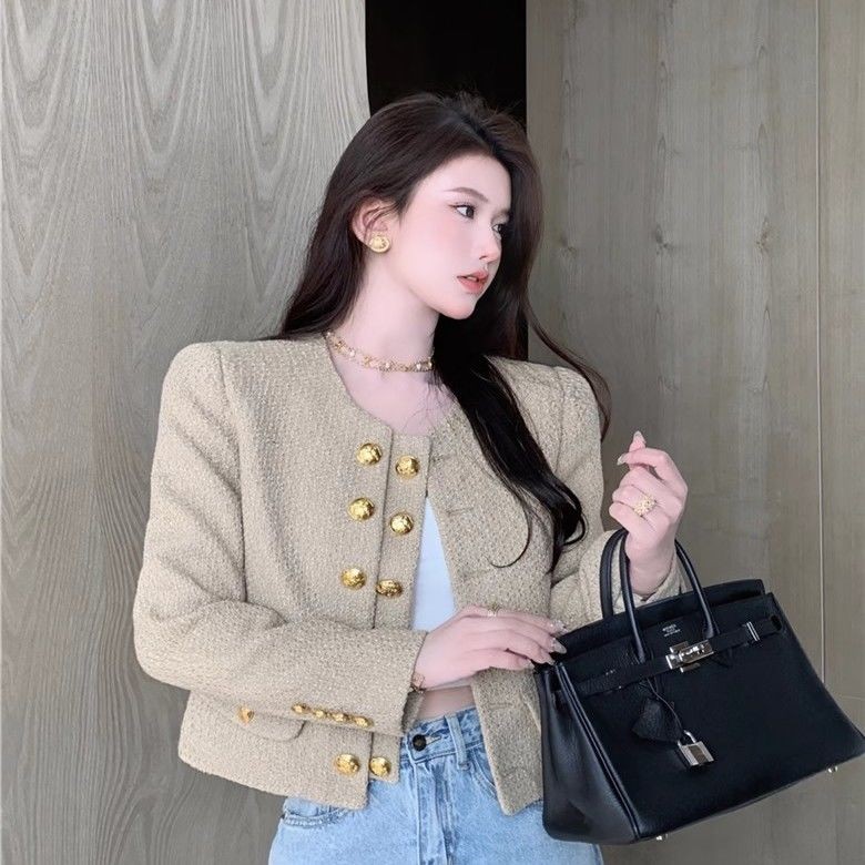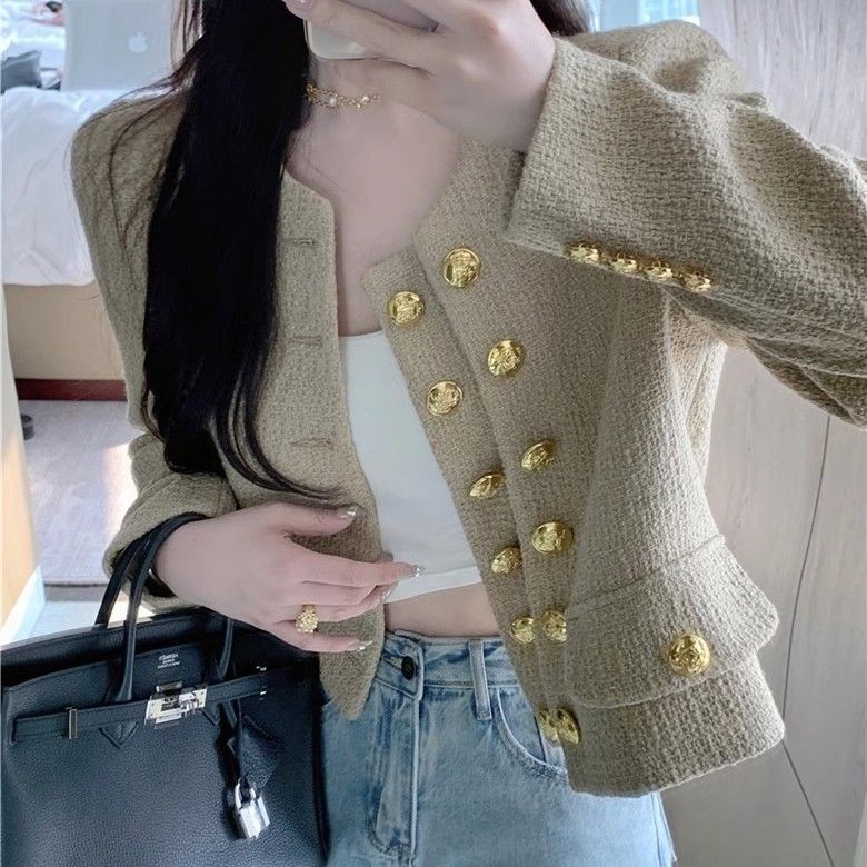 เสื้อแจ็คเก็ตสั้นดีไซน์ระดับไฮเอนด์สไตล์ฝรั่งเศสสำหรับสุภาพสตรี