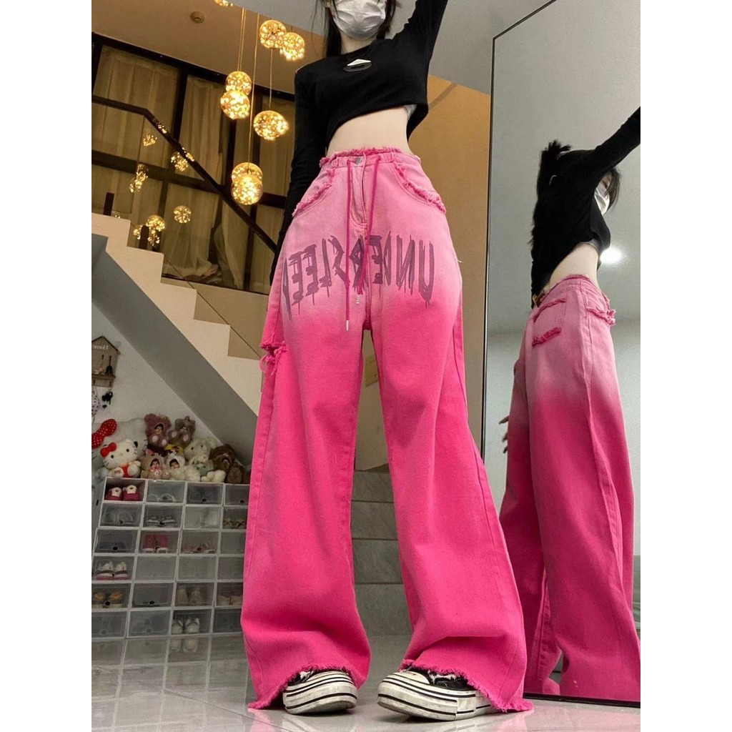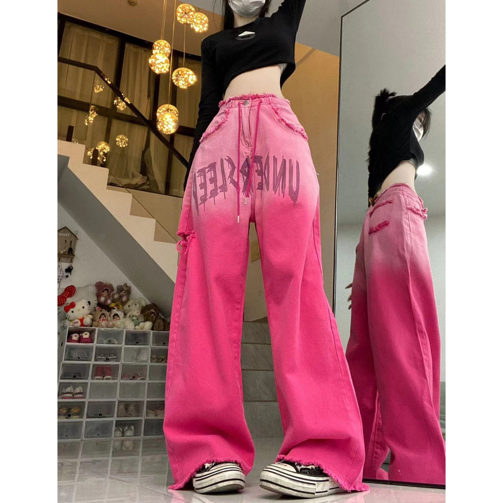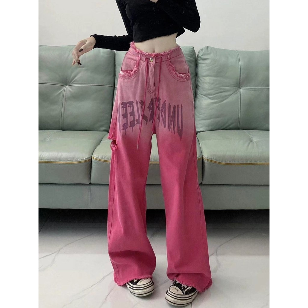 American Retro Pink Ripped กางเกงยีนส์ผู้หญิง Drawstring Design หลวม Slimmer ดูกางเกงขากว้าง