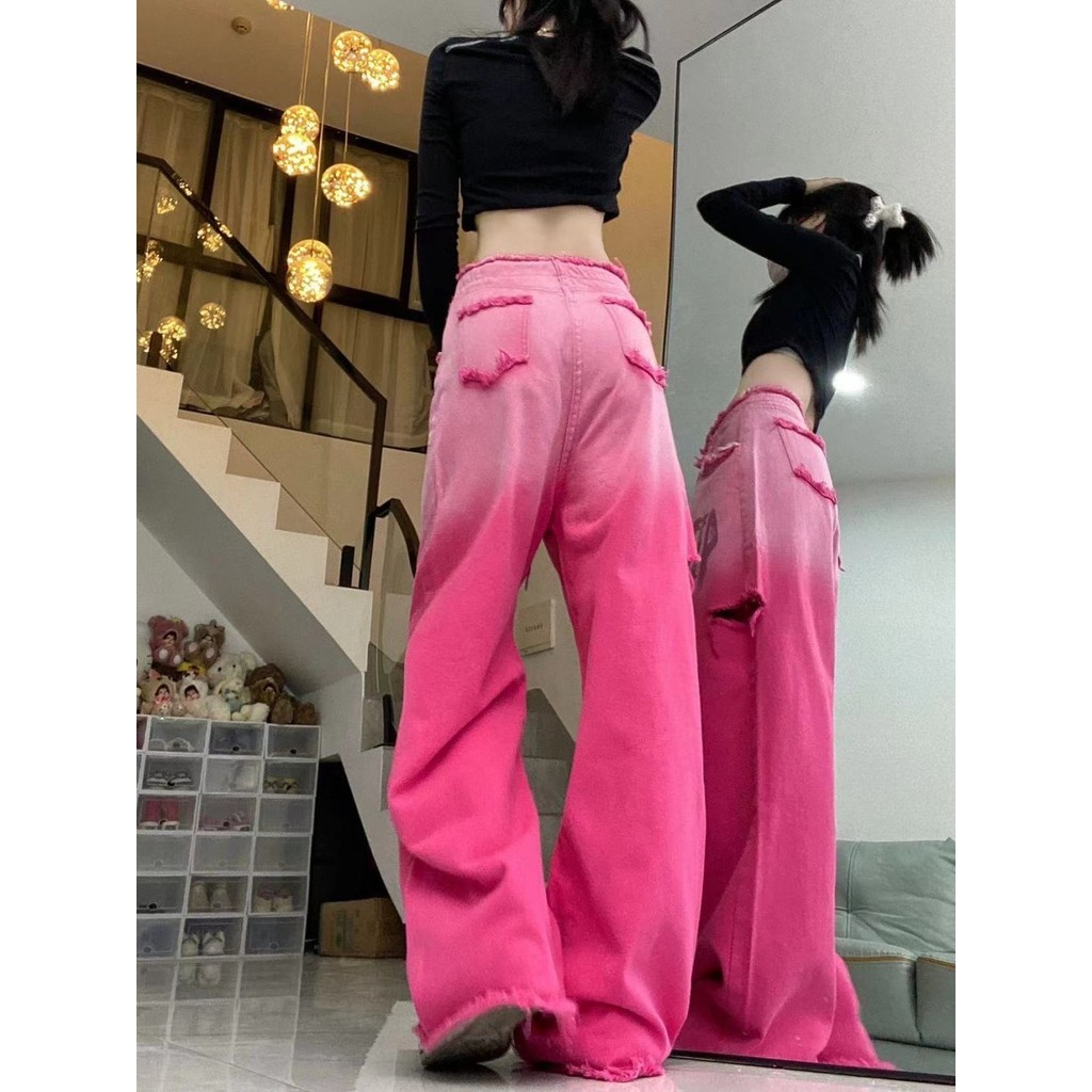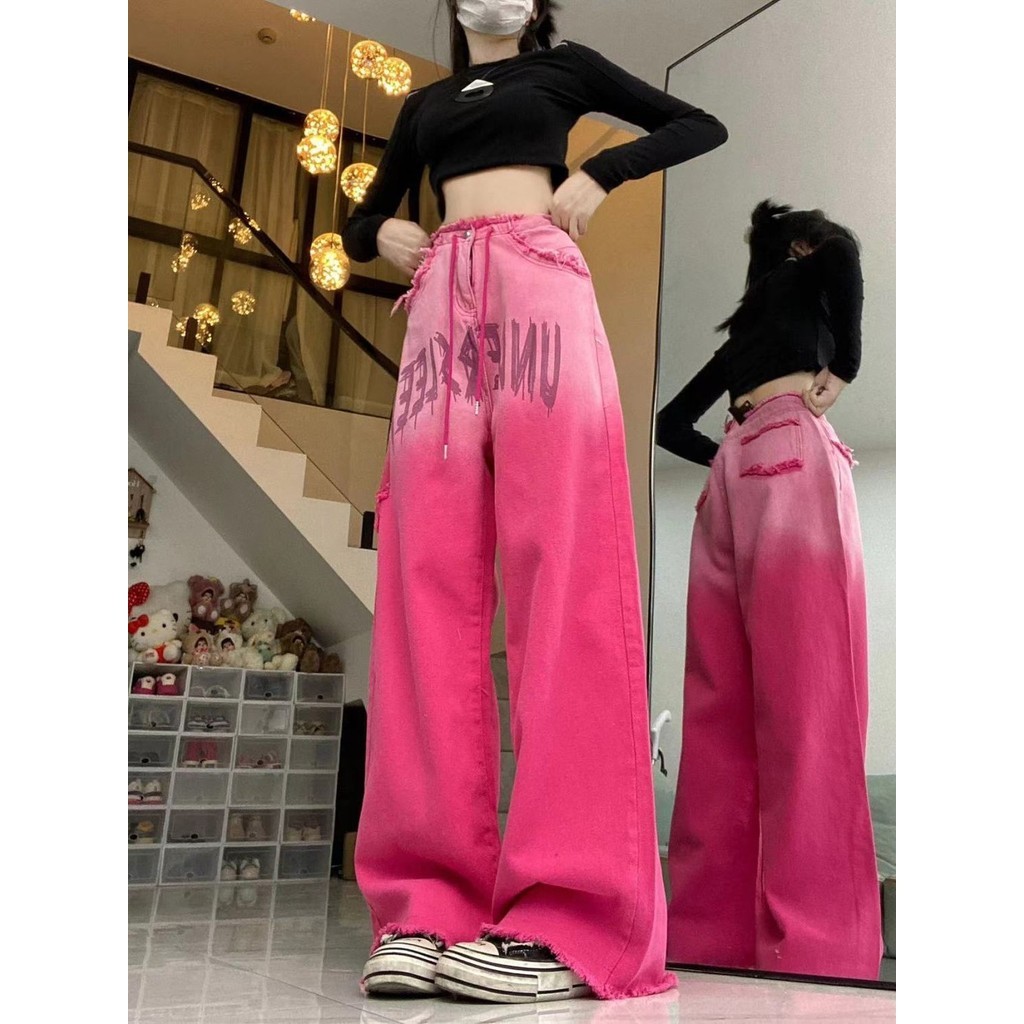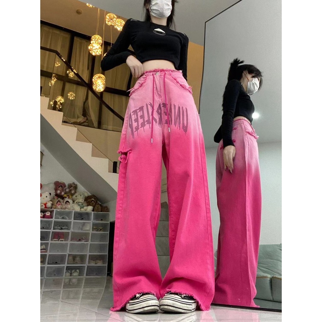 American Retro Pink Ripped กางเกงยีนส์ผู้หญิง Drawstring Design หลวม Slimmer ดูกางเกงขากว้าง