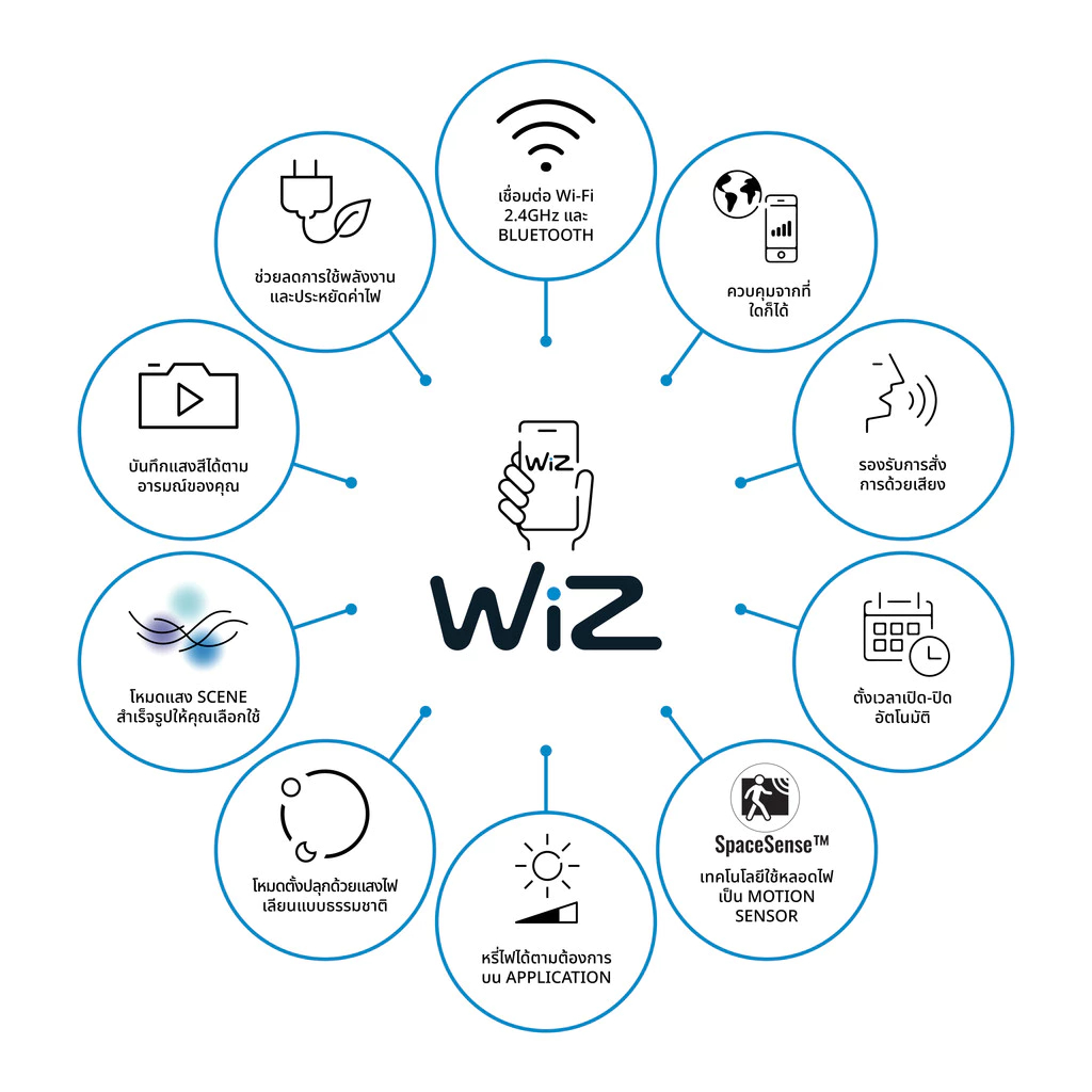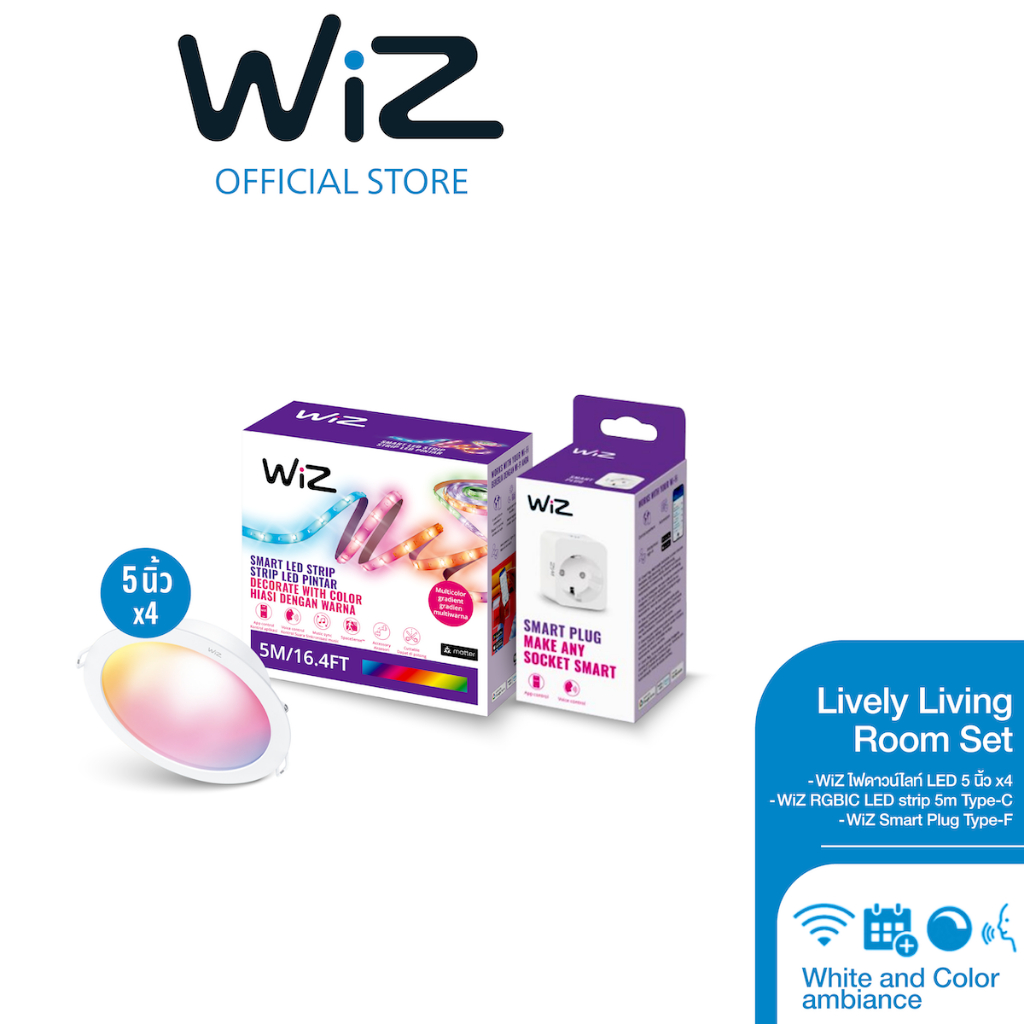[Lively Living Room set]WiZ ไฟดาวน์ไลท์ LED อัจฉริยะ 16ล้านเฉดสีx4 +WiZ RGBIC LED strip 5m Type-C+WiZ Smart Plug Type-F