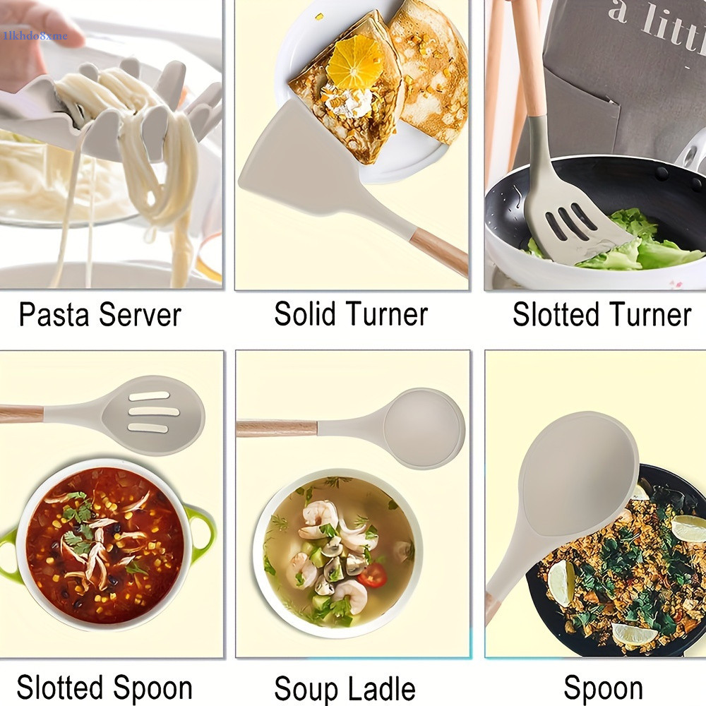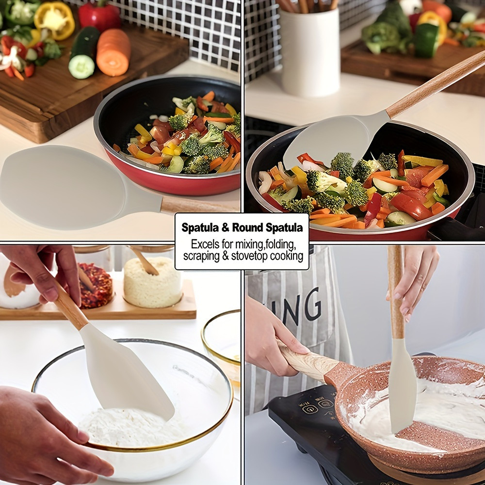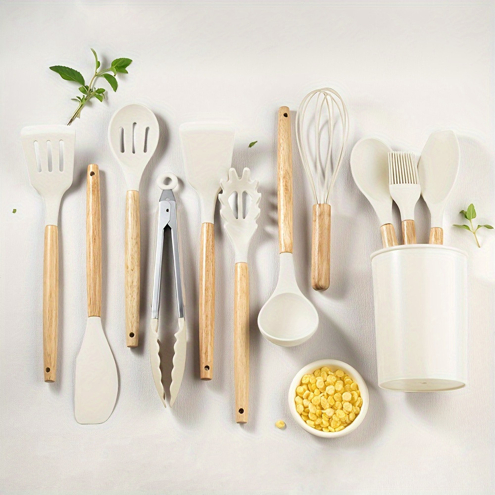 🔥🔥🔥COD12Pcs/Set W-ooden Handle Silicone Kitchen Utensils With Storage Bucket High Temperature Resistant Eco-Friendly