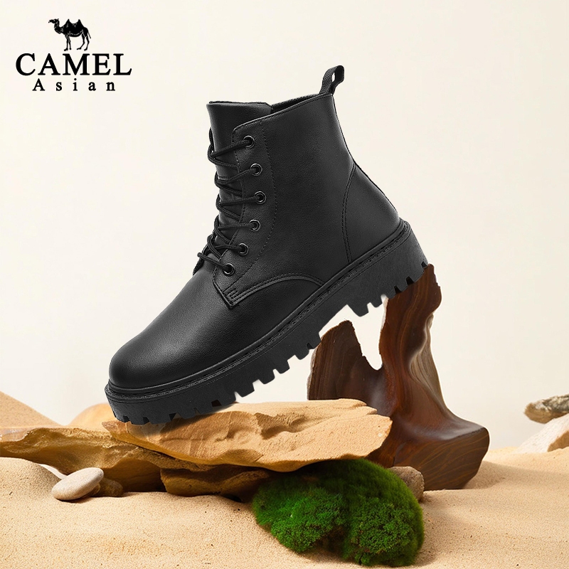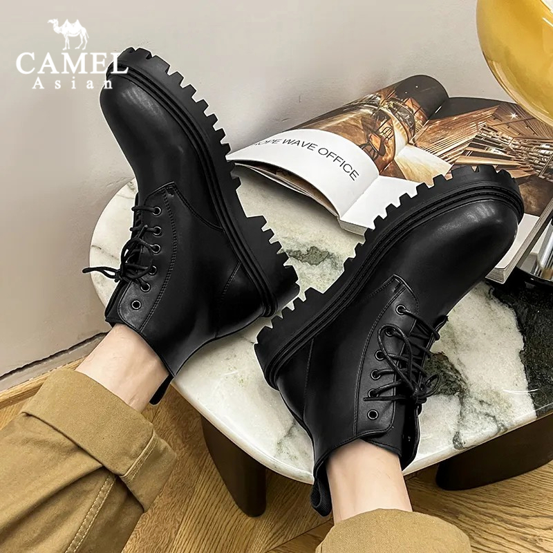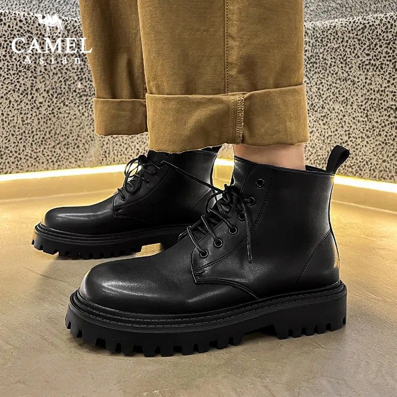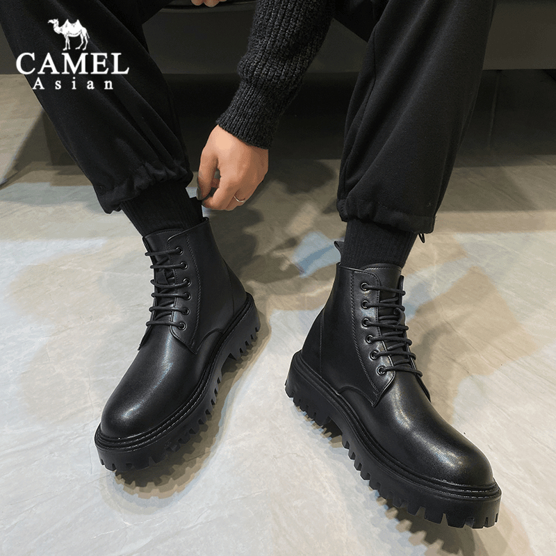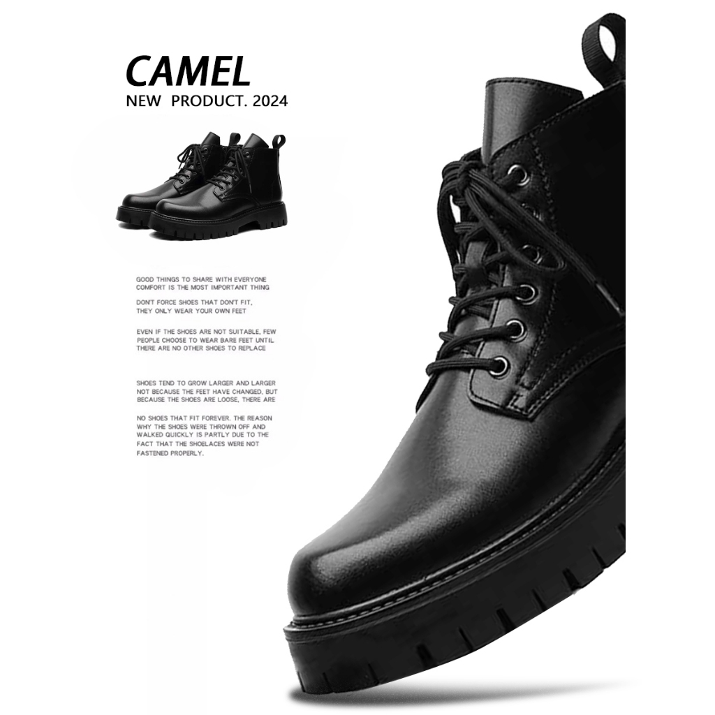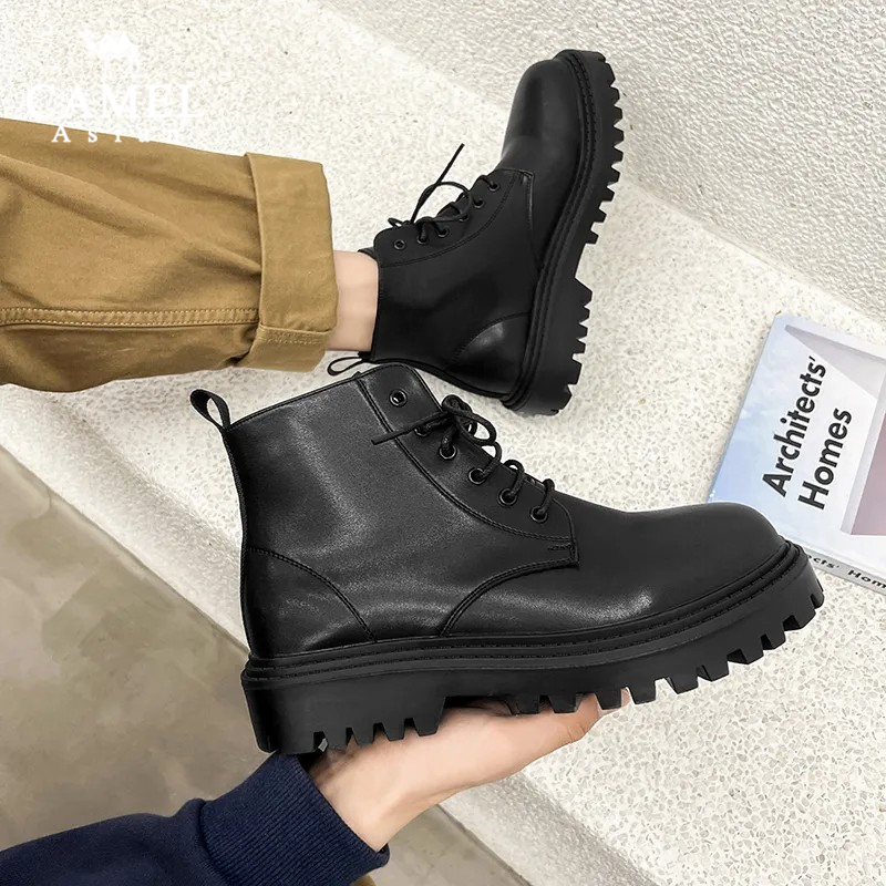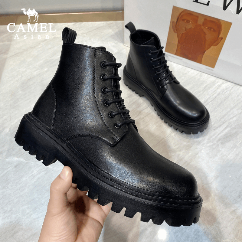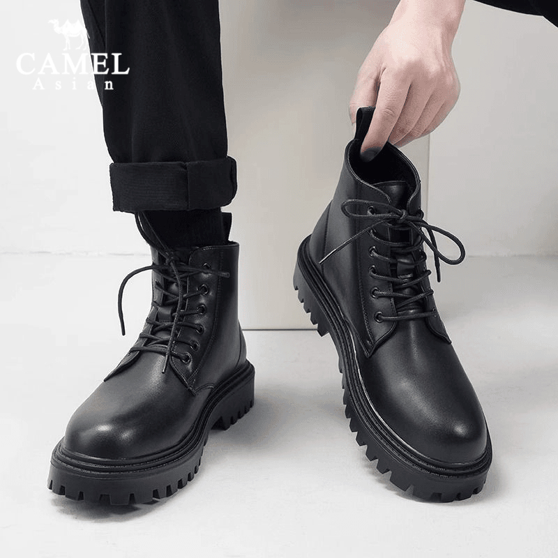 fashion รองเท้าบูทมาร์ตินผู้ชายหนังสีดำอัปเปอร์ ผูกเชือก