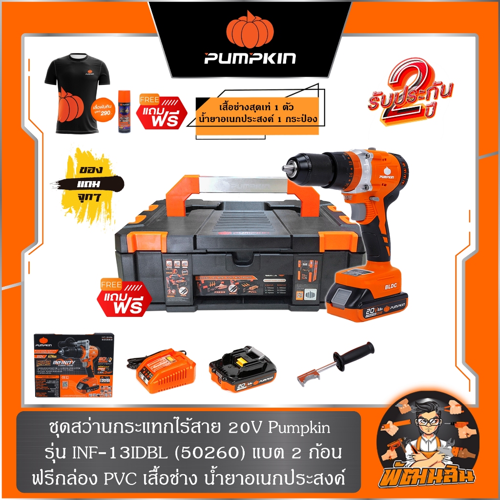 🧡ของแถมเพียบ🧡สว่านกระแทกไร้สาย 1/2" 20V แบต 2.0Ah 2 ก้อน PUMPKIN รุ่น INF-13IDBL (50260) รับประกันศูนย์ 2 ปี