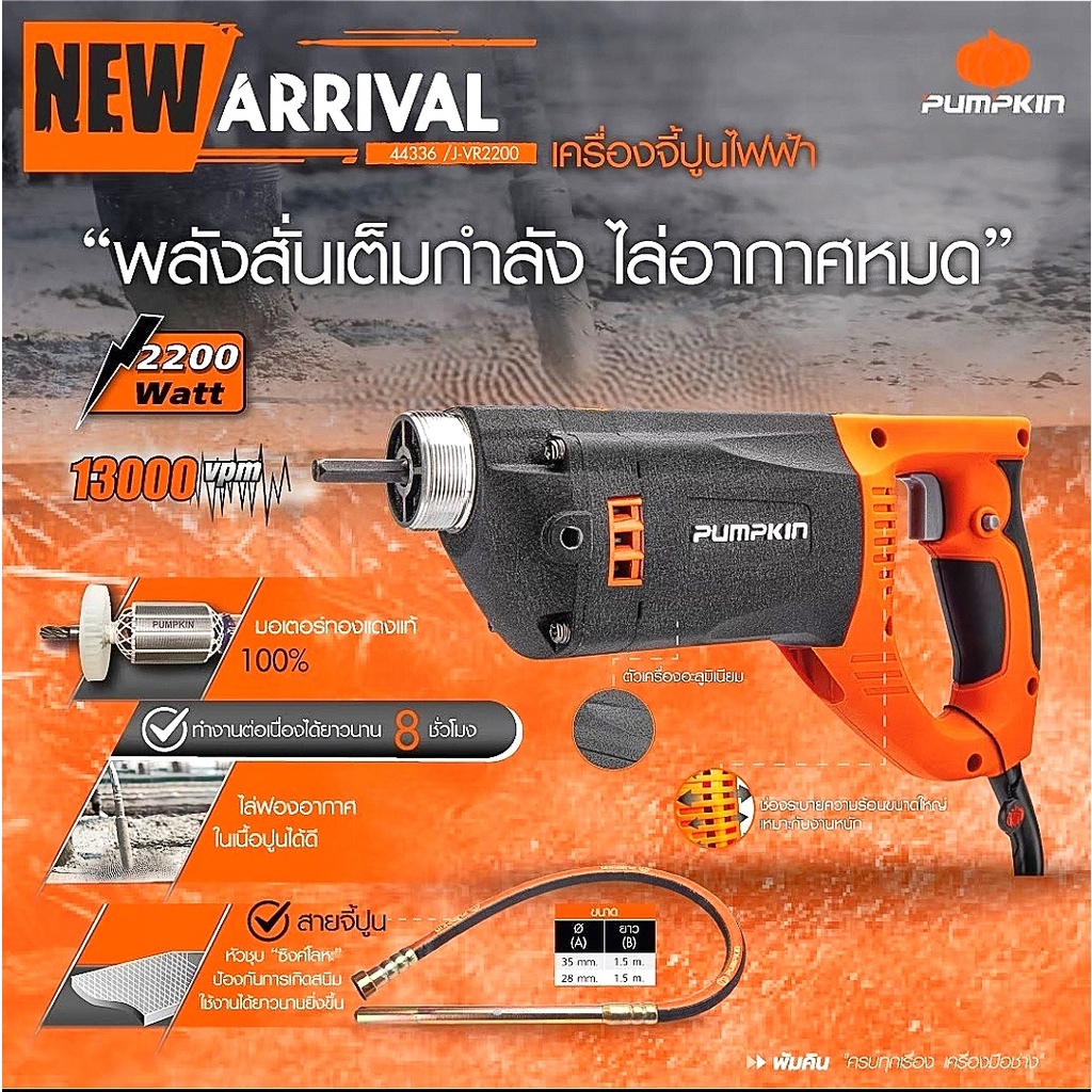 🧡พร้อมส่ง🧡เครื่องจี้ปูน สั่นปูนไฟฟ้าพร้อมสายจี้ยาว 1.5 เมตร (วาย) 2,200W PUMPKIN J-VR2200 (44336) 💥รับประกัน 6 เดือน💥