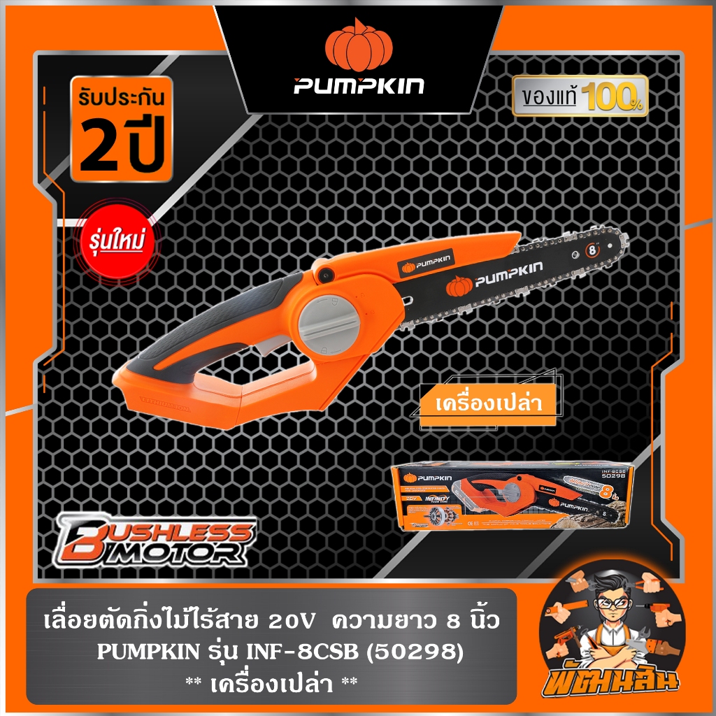 🧡เครื่องเปล่า🧡เลื่อยโซ่ไร้สายไร้แปลงถ่าน 8 นิ้ว 20V PUMPKIN รุ่น 50298 (เครื่องเปล่า) และ ( เฉพาะด้ามต่อยาว )