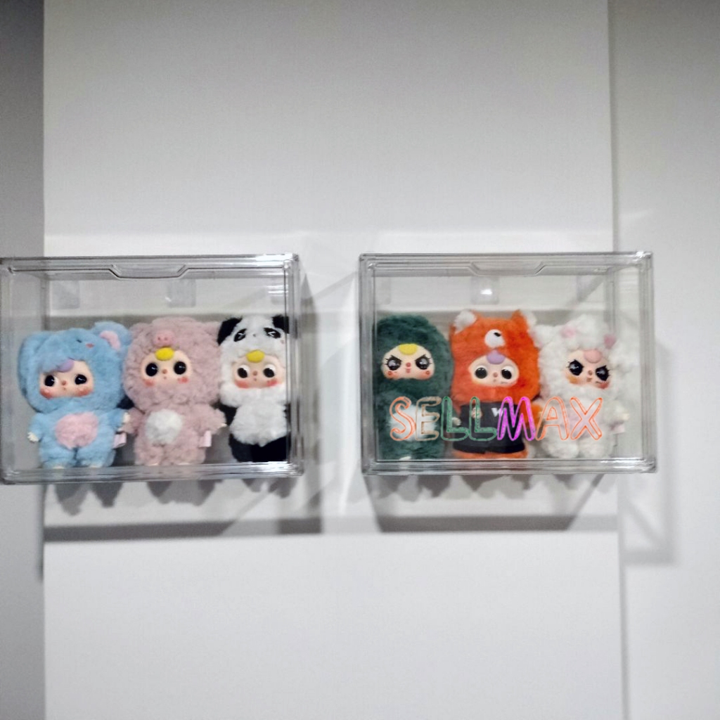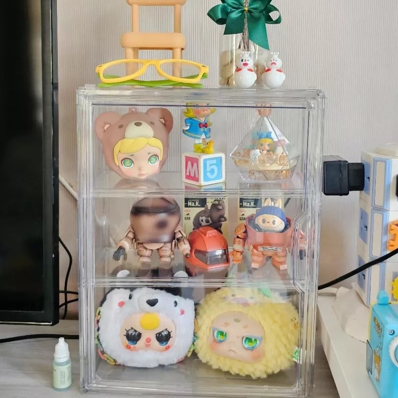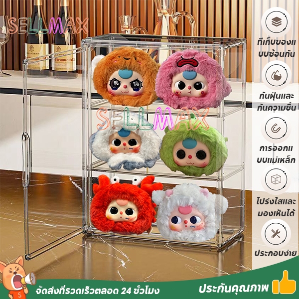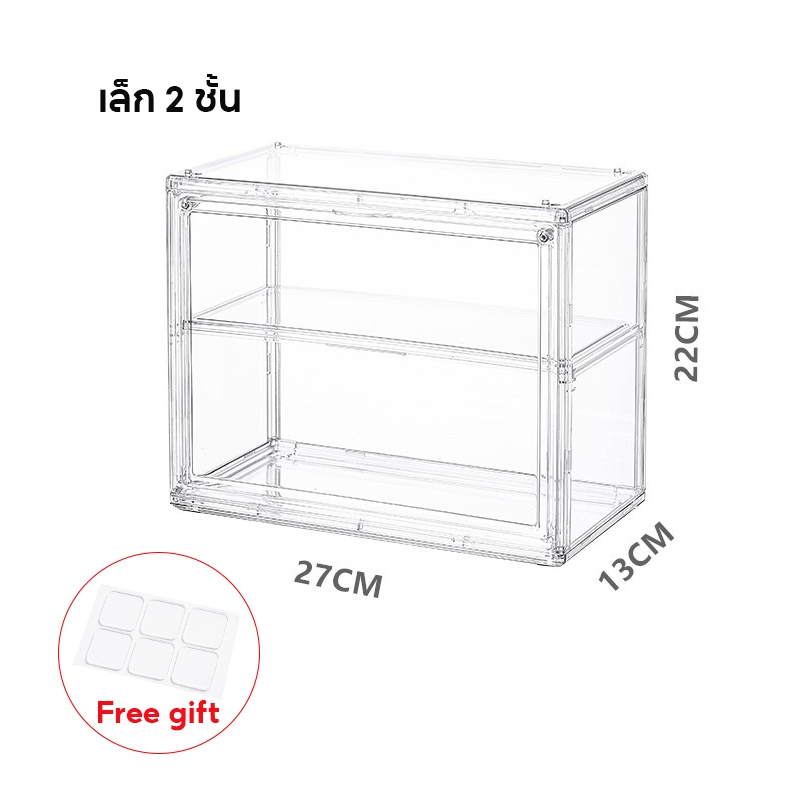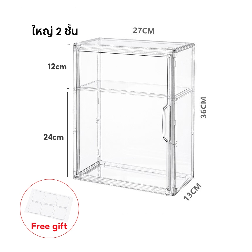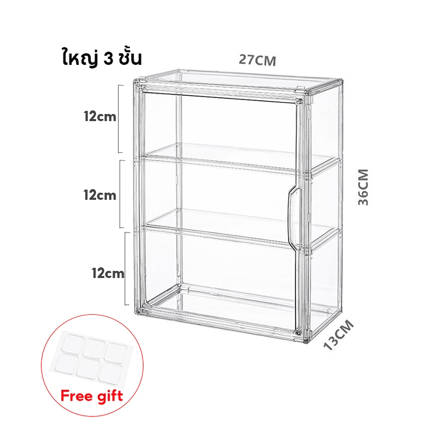 กล่องใสของ ตู้โชว์โมเดลสามชั้น แบบสูง สีไปร่งใส ฝาปิดแม่เหล็ก มีแผ่นกาวแถมให้ สามาถติดกับผนังได้