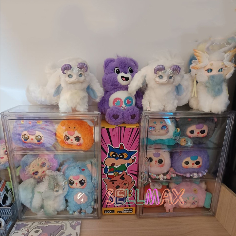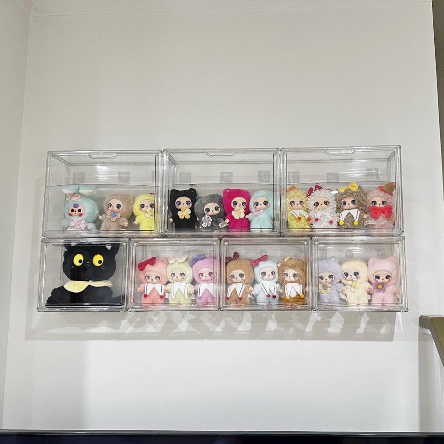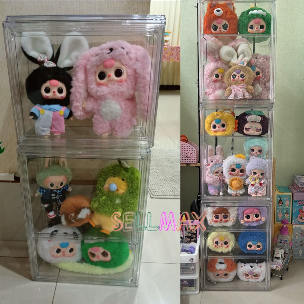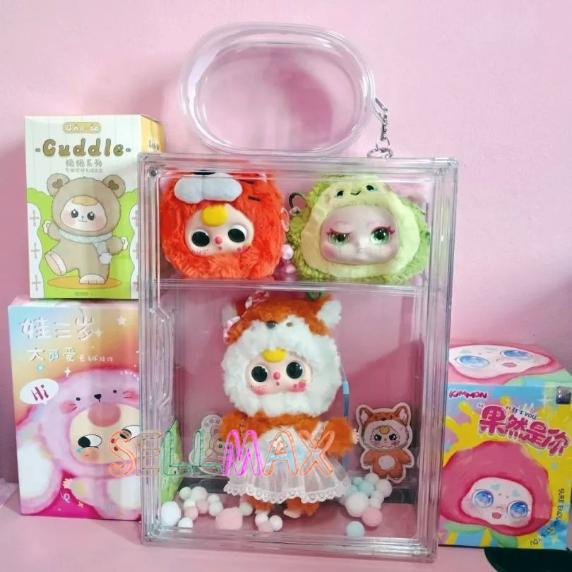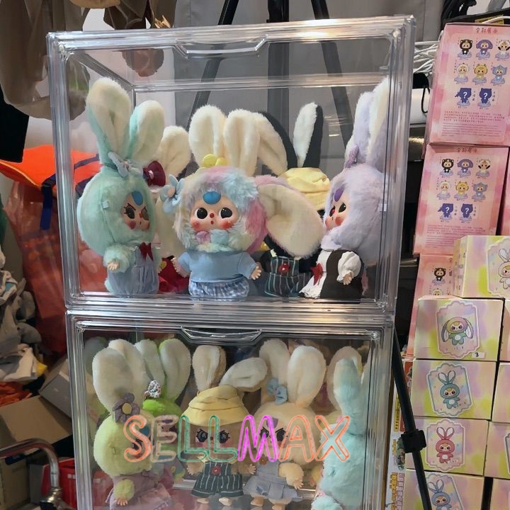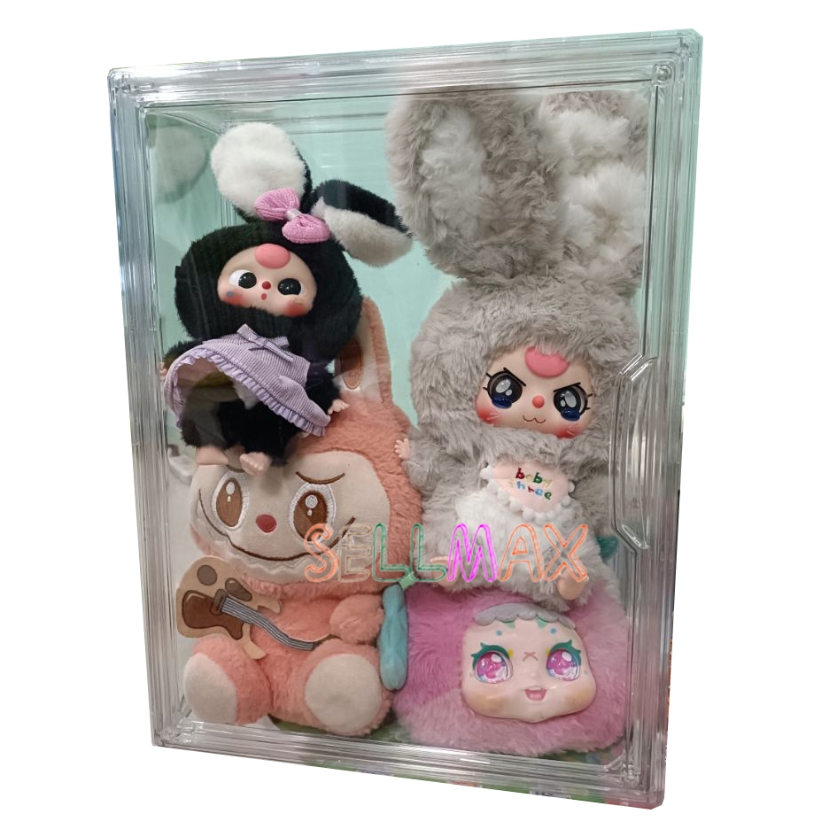 กล่องใสของ ตู้โชว์โมเดลสามชั้น แบบสูง สีไปร่งใส ฝาปิดแม่เหล็ก มีแผ่นกาวแถมให้ สามาถติดกับผนังได้