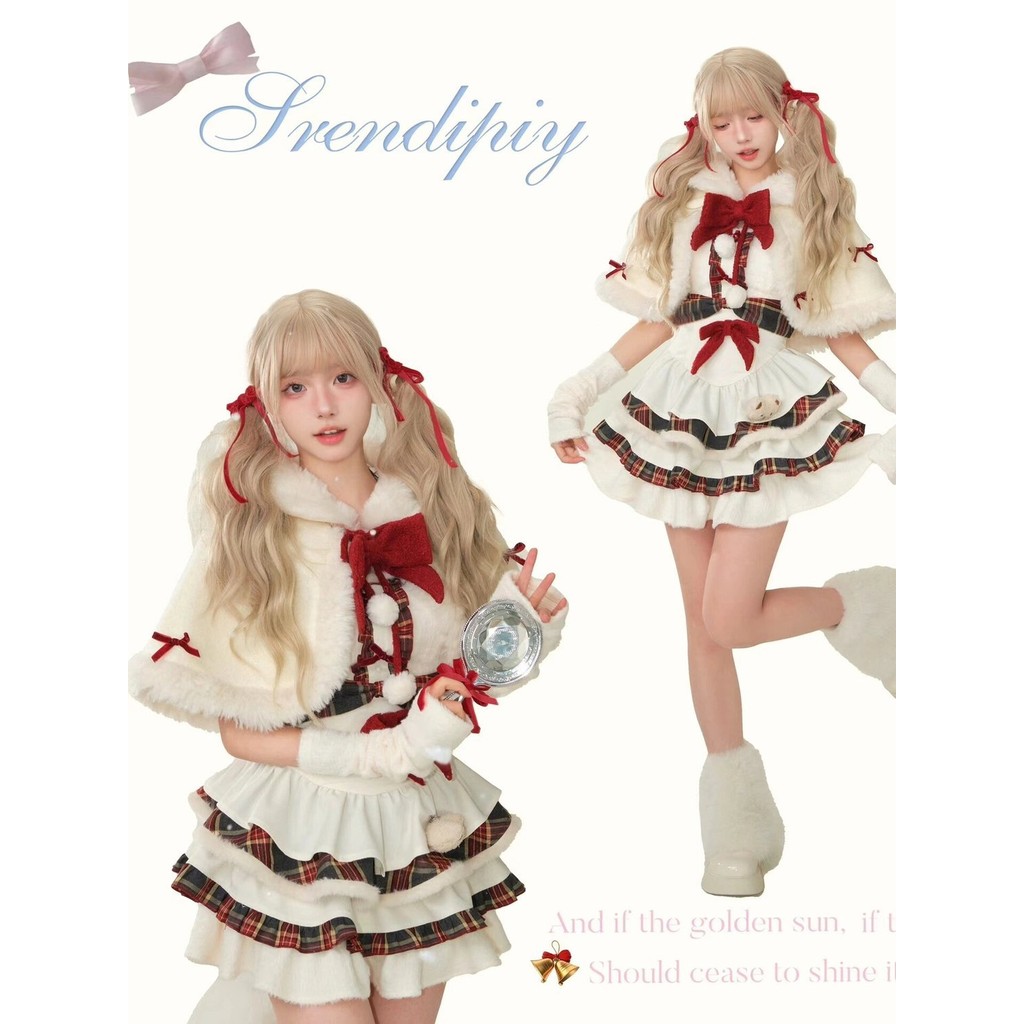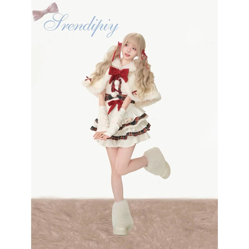 โลลิต้าสาวน่ารักฤดูหนาวคริสต์มาสและปีใหม่เสื้อคลุมขนสัตว์ออกแบบกระโปรงตูตูชุดกระโปรงเค้ก
