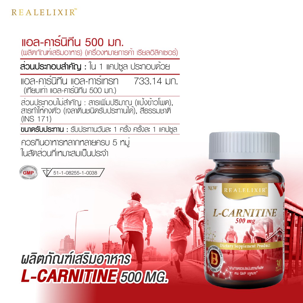 Real Elixir L-Carnitine 500 mg. 30 เม็ด**รูปร่างเพรียวกระชับ เผาผลาญไขมัน เพิ่มพลังให้ร่ างกาย