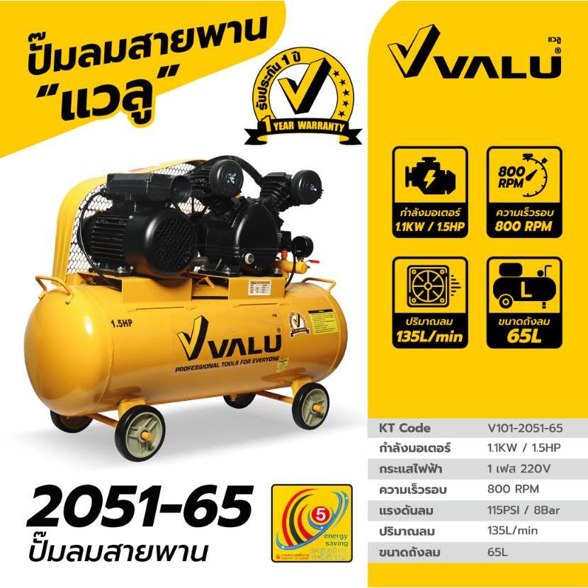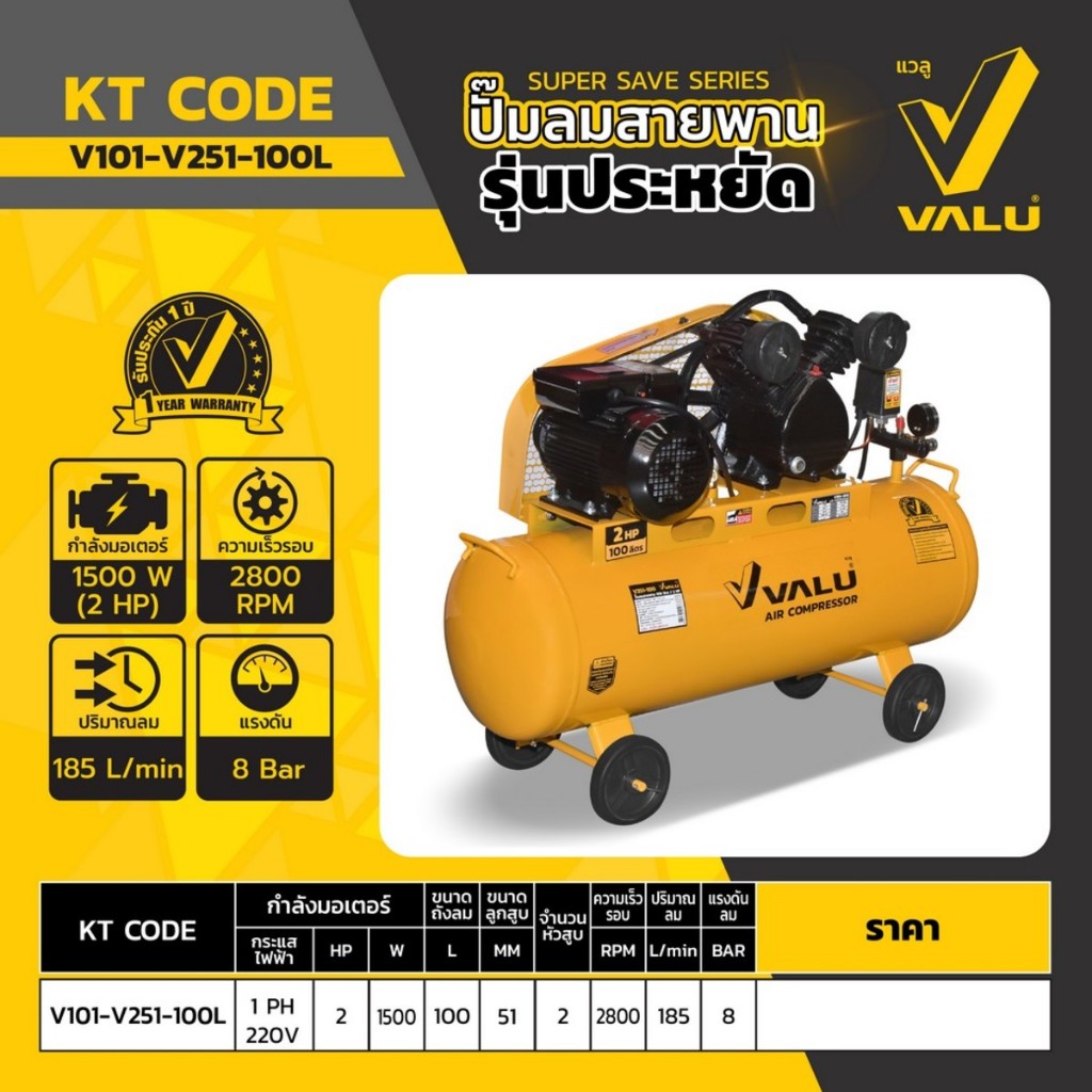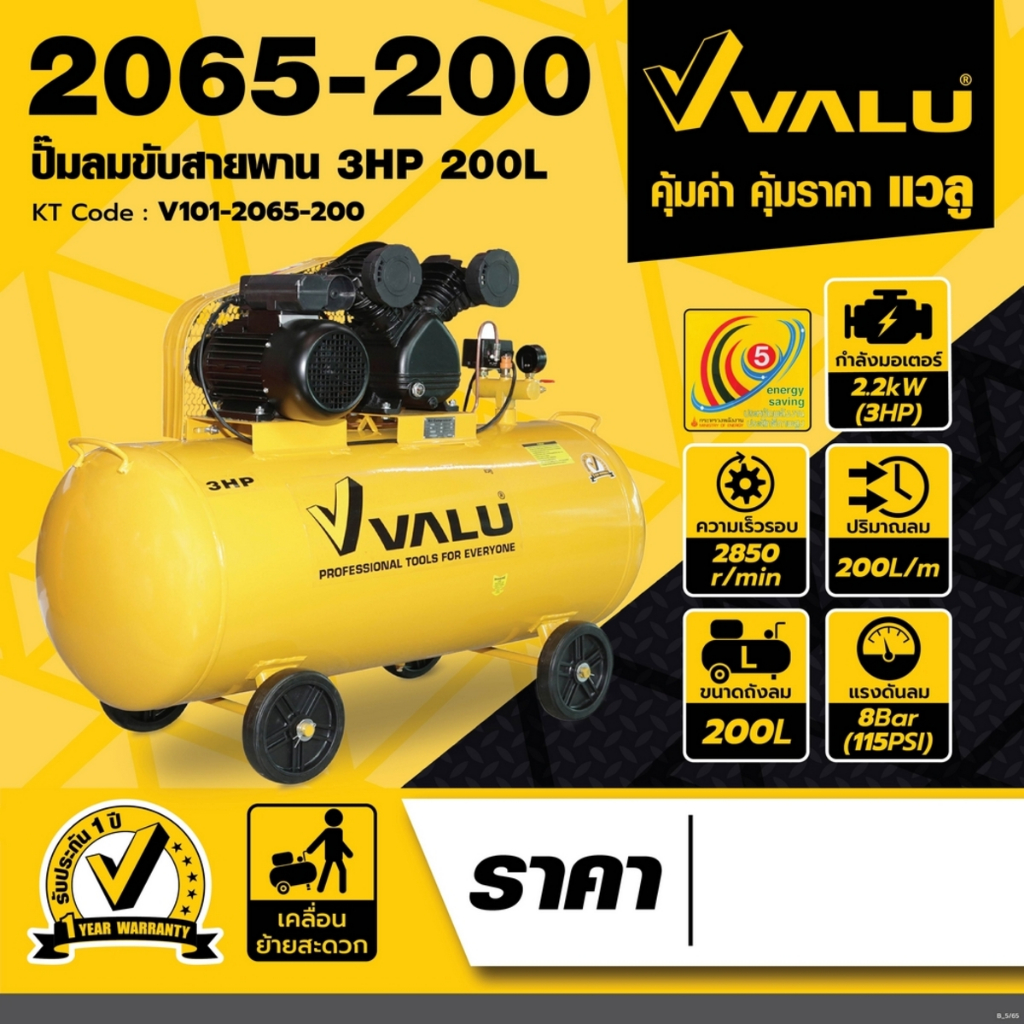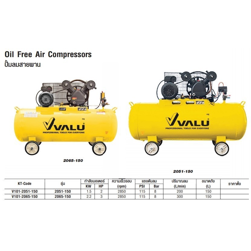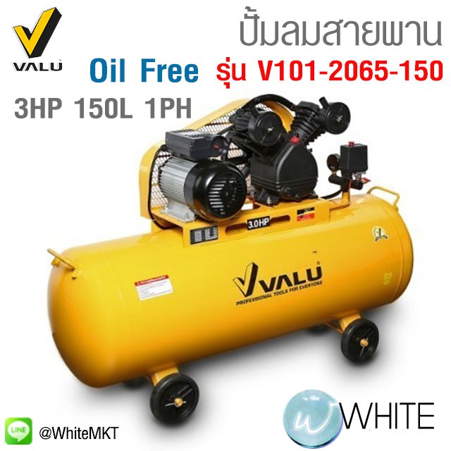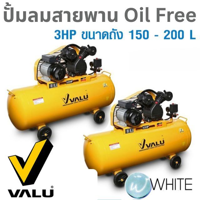 ปั้มลมสายพาน Oil Free 3HP ขนาดถัง 150 - 200 L 1PH ยี่ห้อ VALU