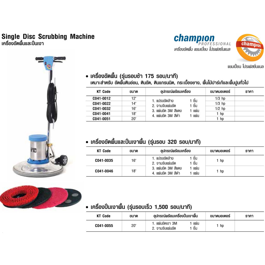 เครื่องขัดพื้น รุ่นรอบช้า 175 รอบต่อนาที ยี่ห้อ CHAMPION
