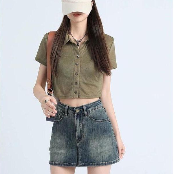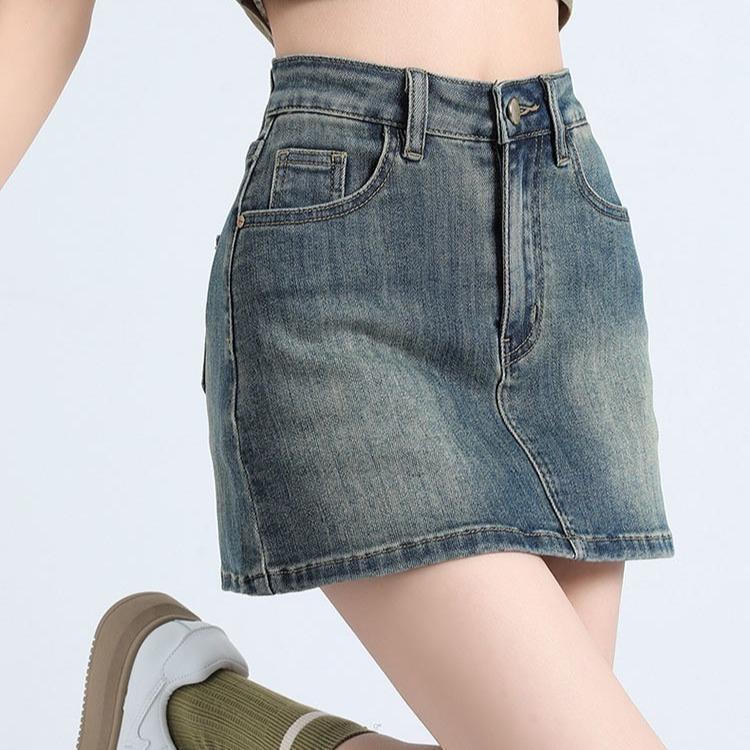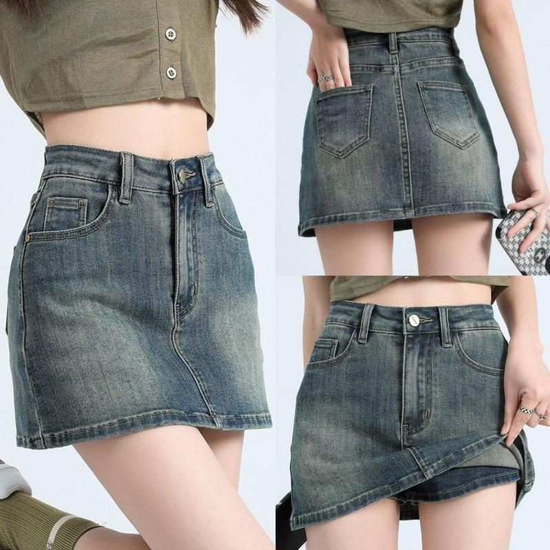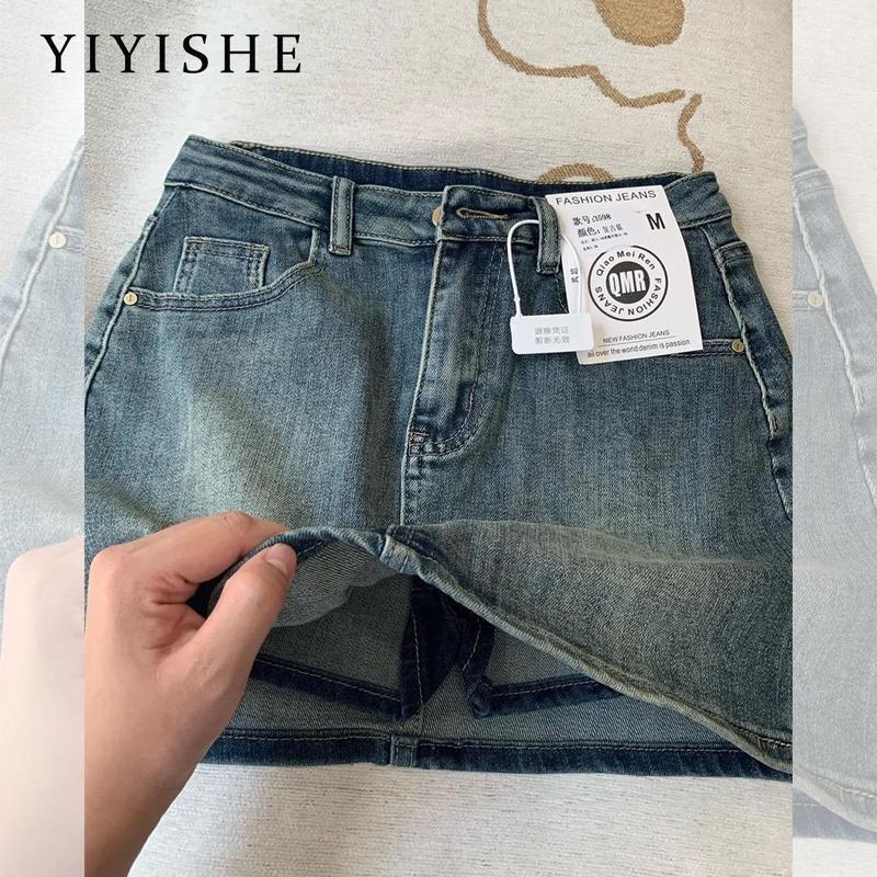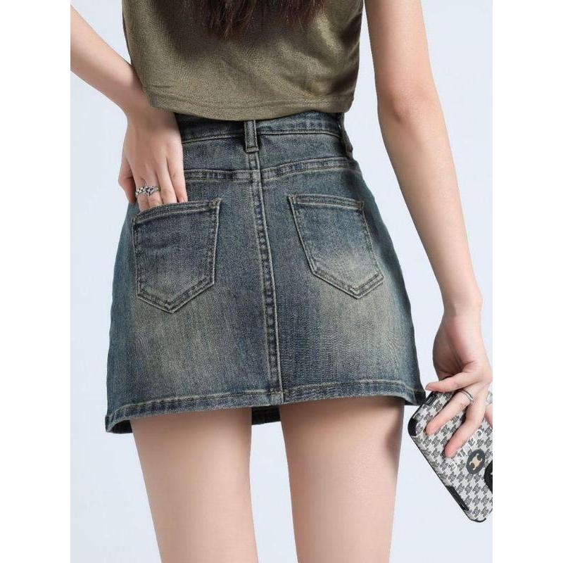 2411# กระโปรงยีนส์สั้นมีซับในกางเกงยีนส์ เอวสูง สีแต่งเฟด กระโปรง Y2K