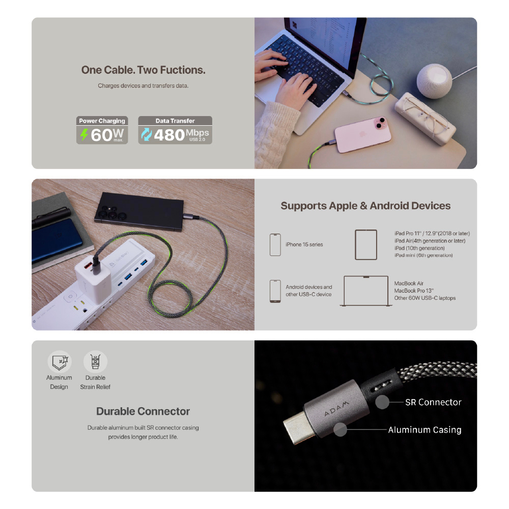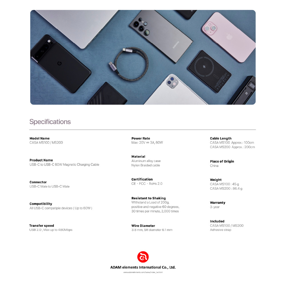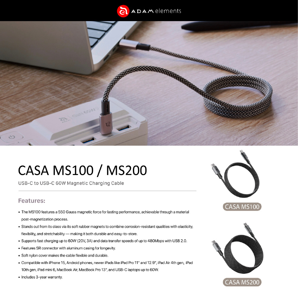 สายชาร์จ ADAM elements CASA C to C Magnetic Cable 60W 1M/2M - รองรับเอาต์พุตการชาร์จสูงสุด 60W