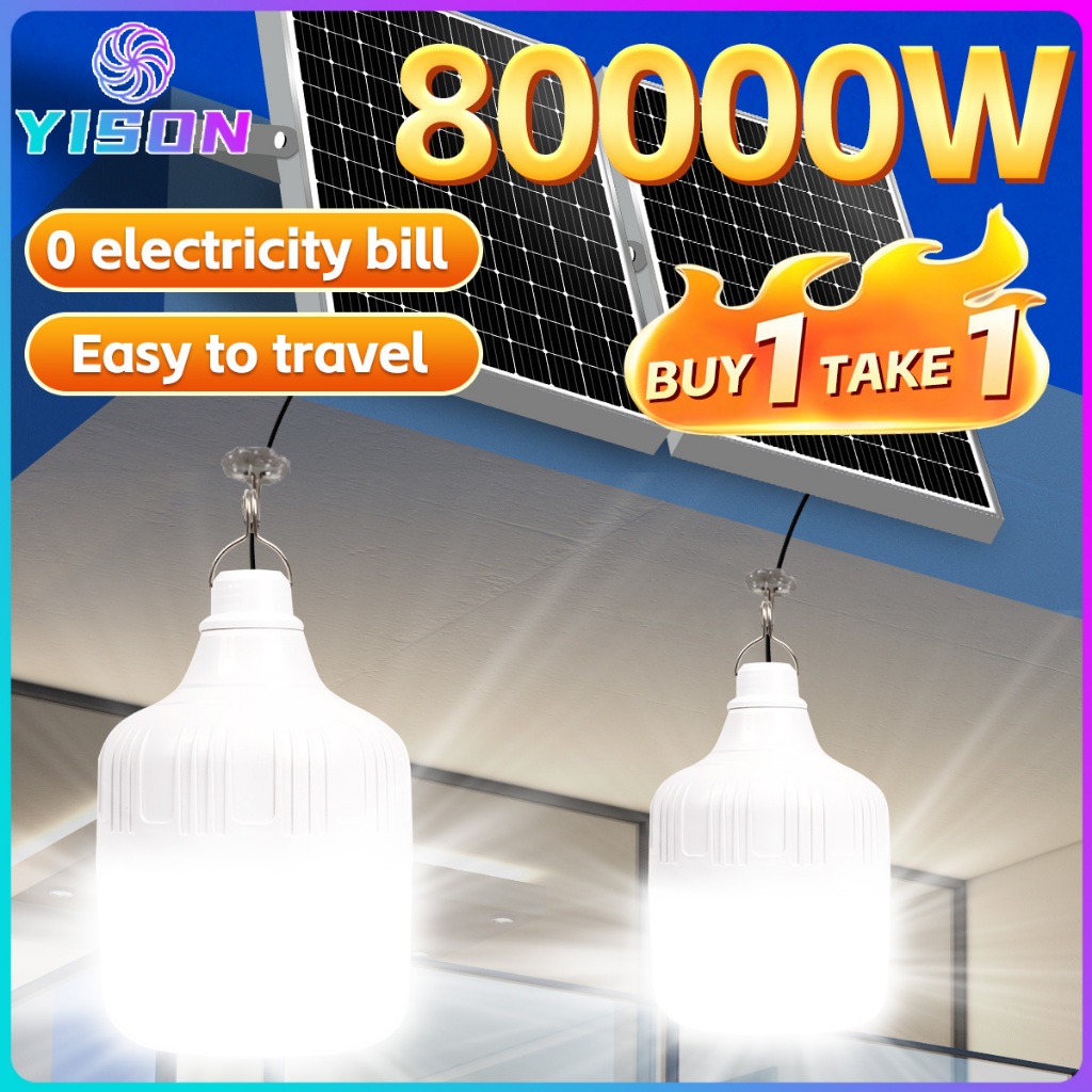 YISON Solar light หลอดไฟโซล่าเซลล์ ไฟโซล่าเซลล์ 80000W ไฟตั้งแคมป์ ไฟโซลาเซลล์ค่าไฟ 0บาท LED สว่าง10-16 ชม หลอดไฟมีแบตเต