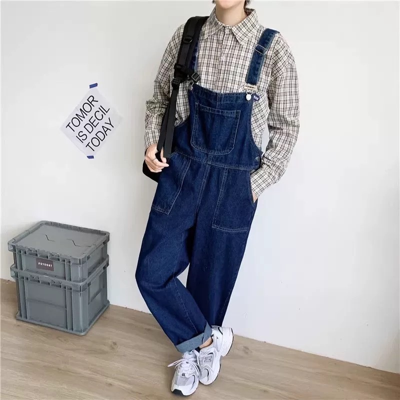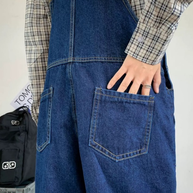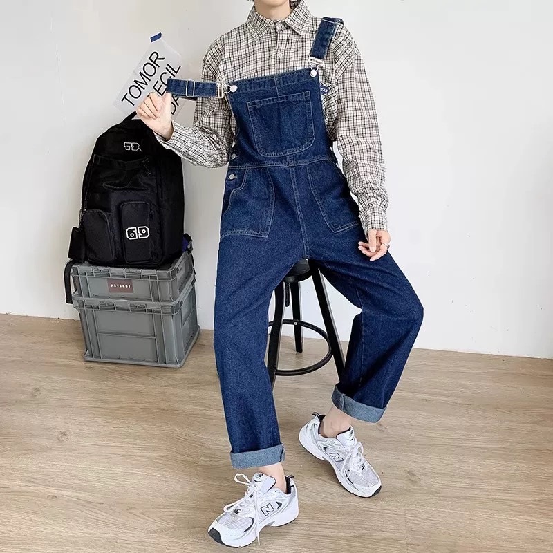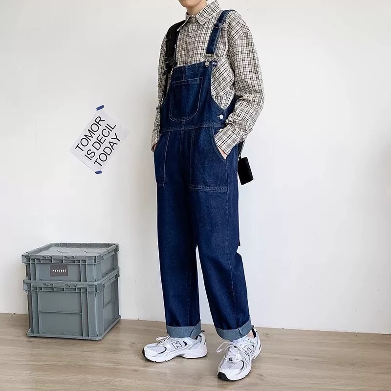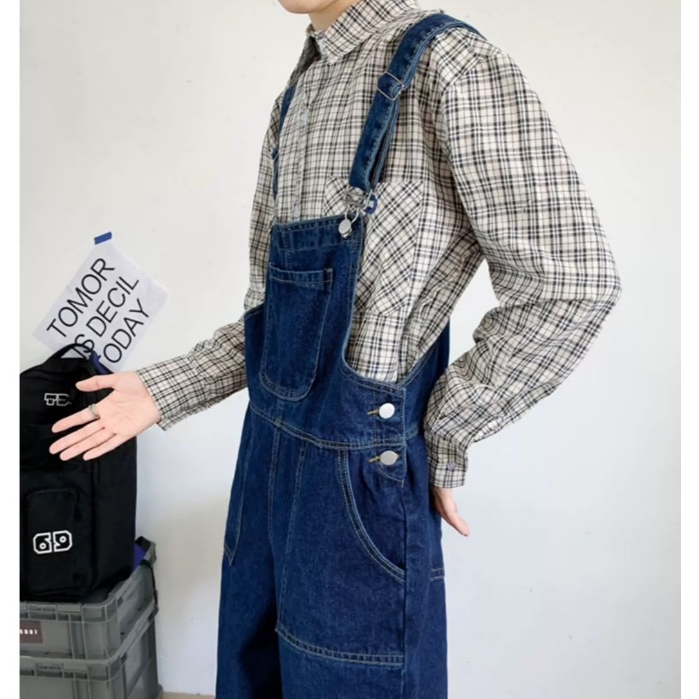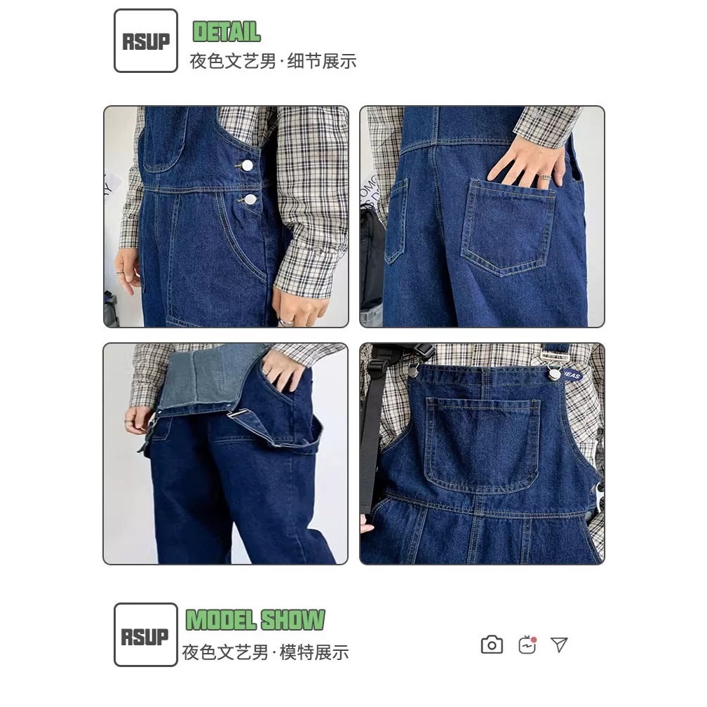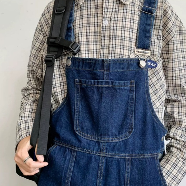 ชุดเอี๊ยมยีนส์แฟชั่นผู้ชาย มีกระเป๋าด้านหน้าและกระเป๋าข้าง สไตล์วินเทจผู้ชายเกาหลี ผ้ายีนส์แท้สีเข้ม กำลังอินเทรนด์