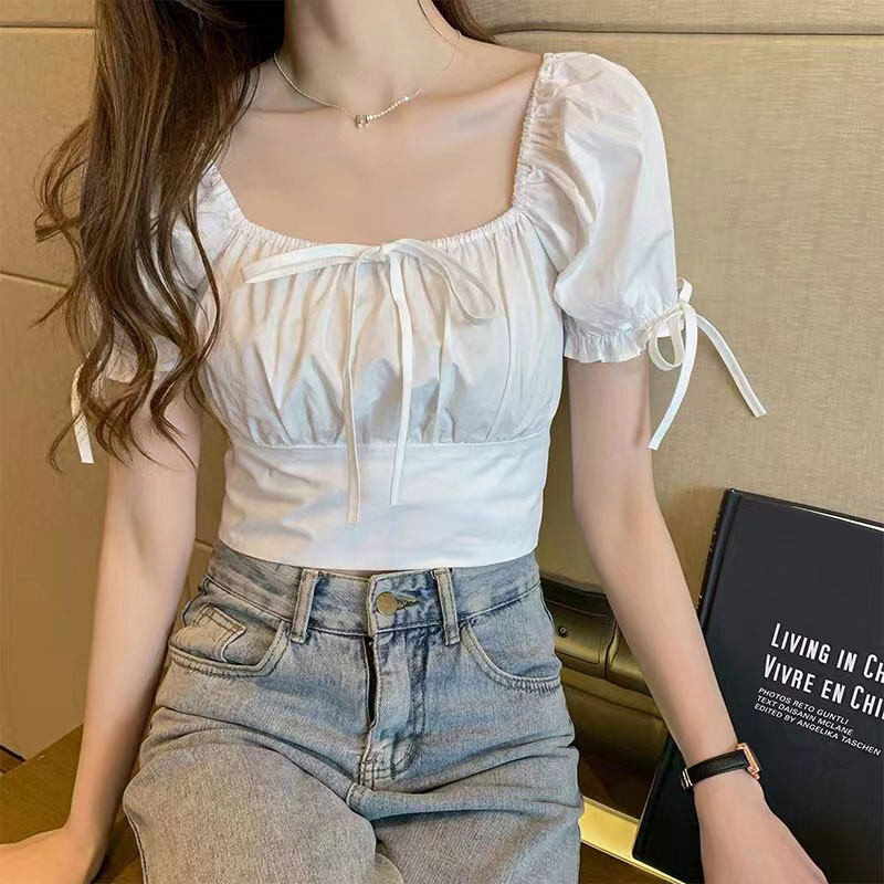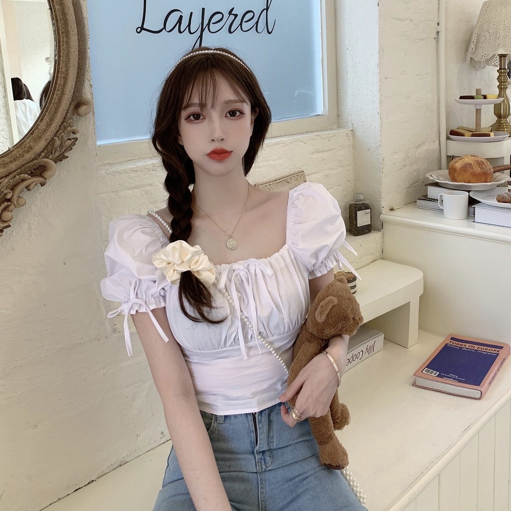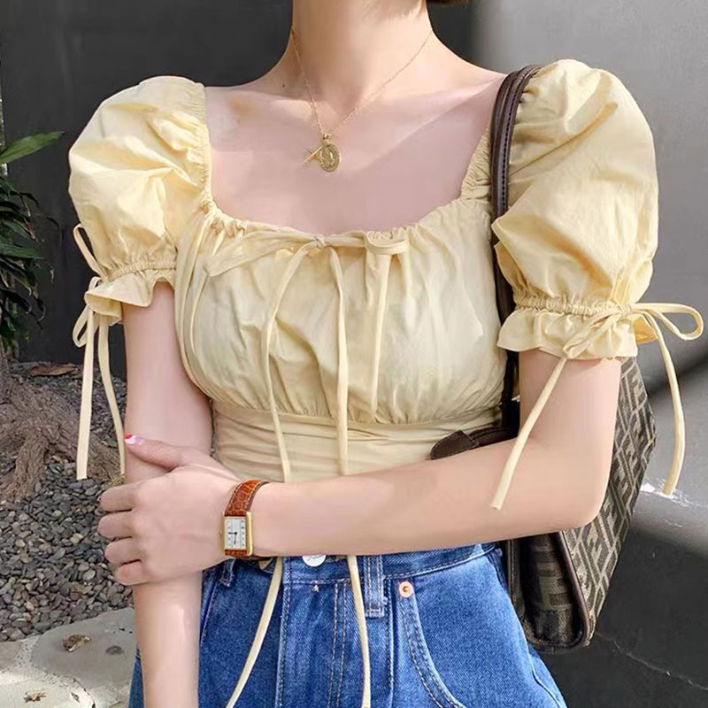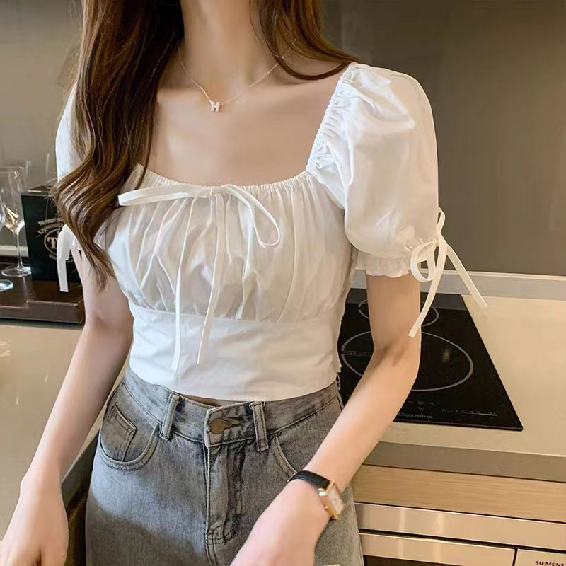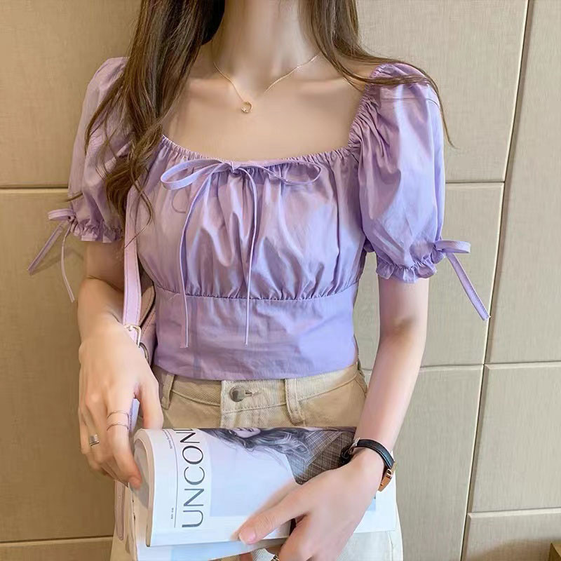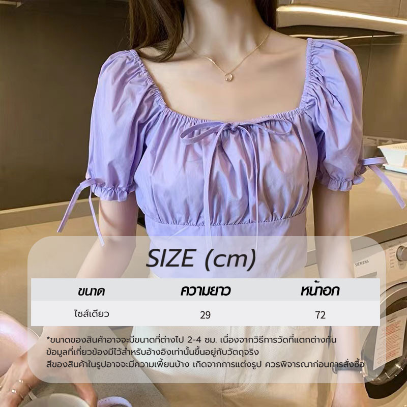 【จัดส่งฟรี】เสื้อเอวลอยสตรี สไตล์เกาหลี รับลมร้อน เสื้อผู้หญิง เสื้อผู้หญิง เสื้อครอปแขนพอง สม็อคเอว สีพื้น สไตล์เกาหลี