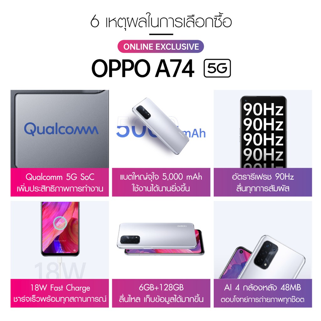 OPPO A74 5G (6+128GB) หน้าจอ 6.5 นิ้ว, แบต 5000mAh กดฟรี mini fan