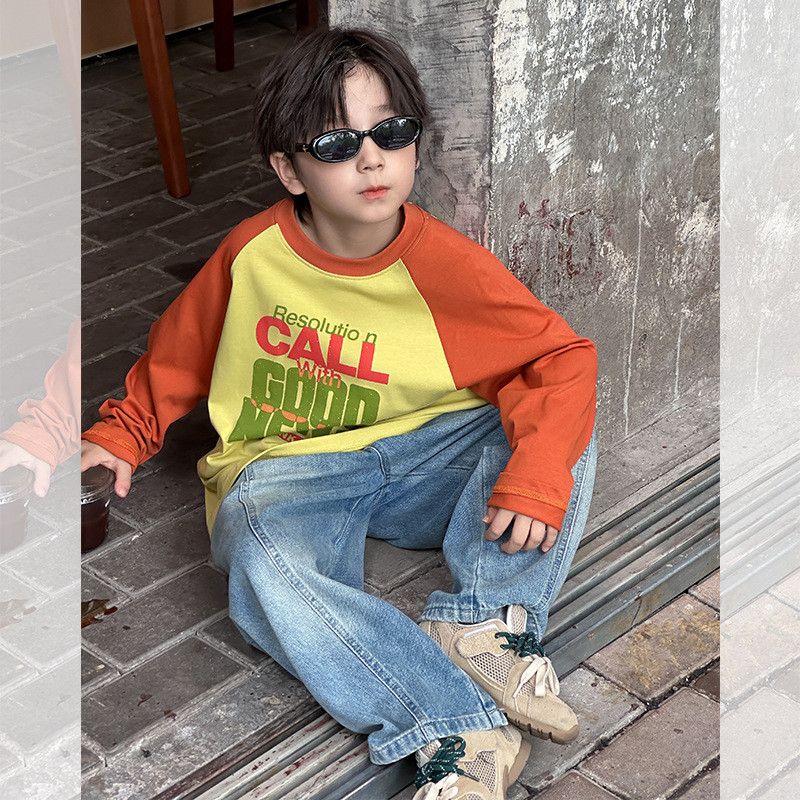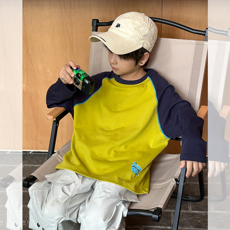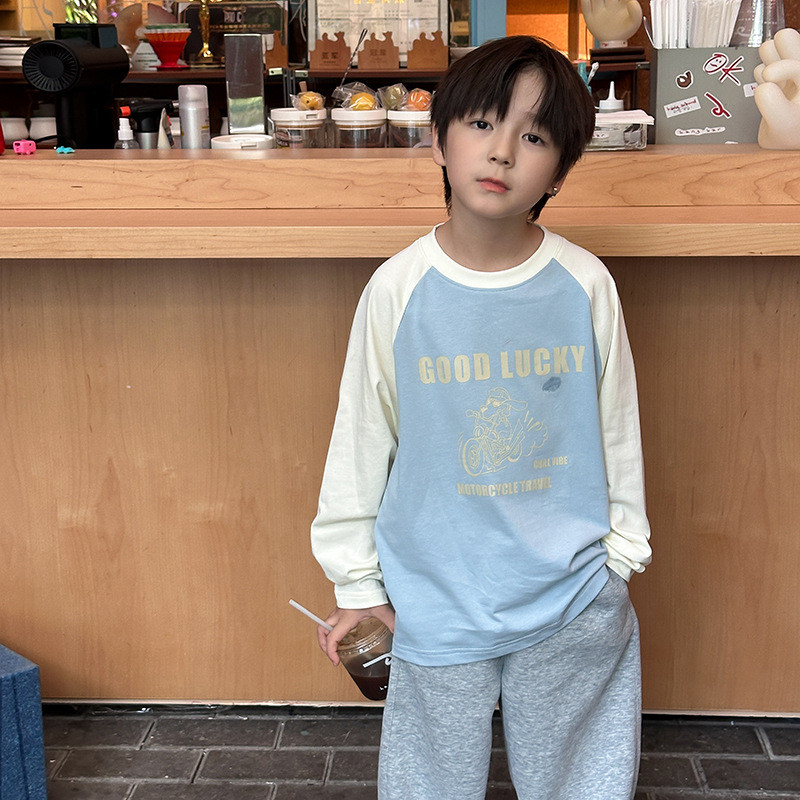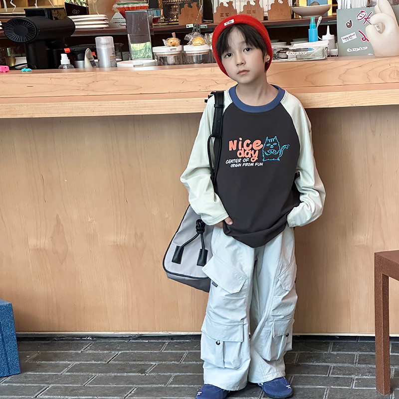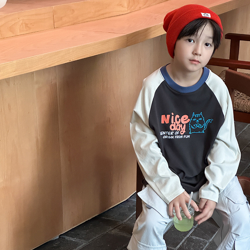 เสื้อยืดรุ่นใหม่สำหรับเด็ก การ์ตูนตัวอักษรแบบ Raglan สไตล์ฤดูใบไม้ร่วง ปี 2025 พร้อมลายเส้นด้ายคู่จากผ้าฝ้าย