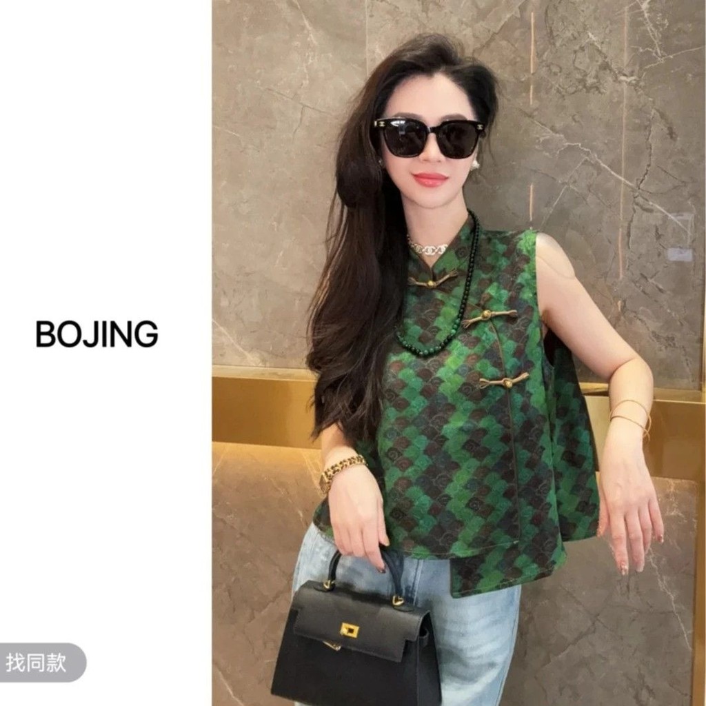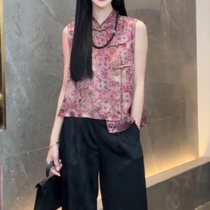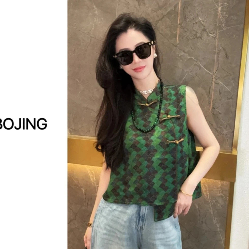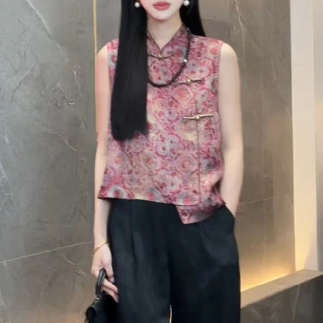 เสื้อแขนกุดสำหรับผู้หญิงสไตล์จีนย้อนยุคปี 2025 แบบ slimmer พร้อมการพิมพ์และปุ่ม เหมาะสำหรับทุกโอกาส