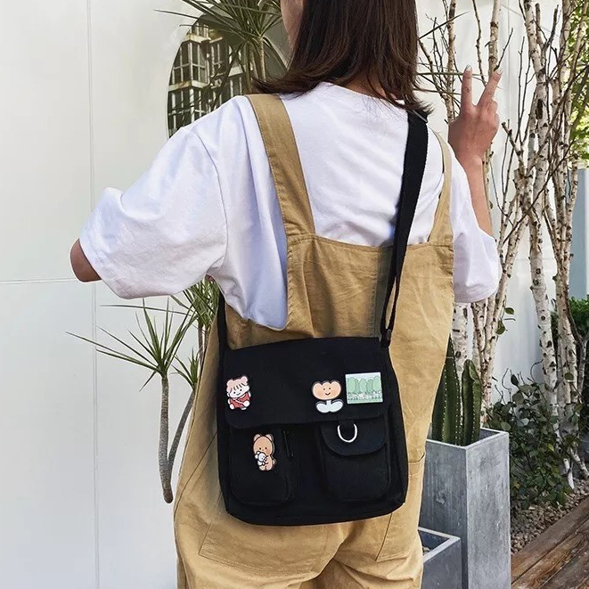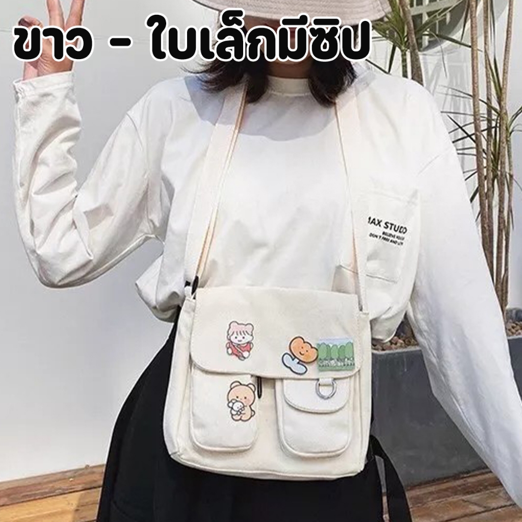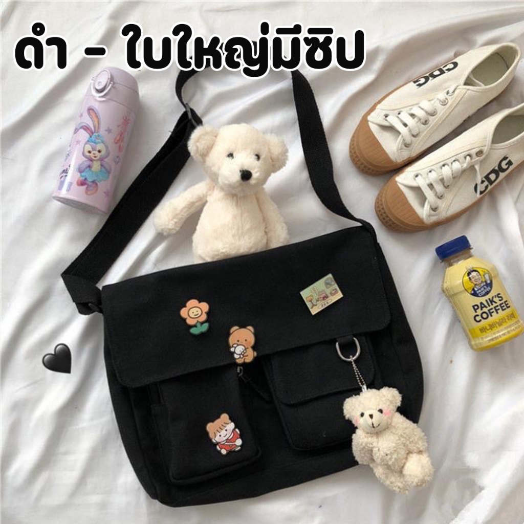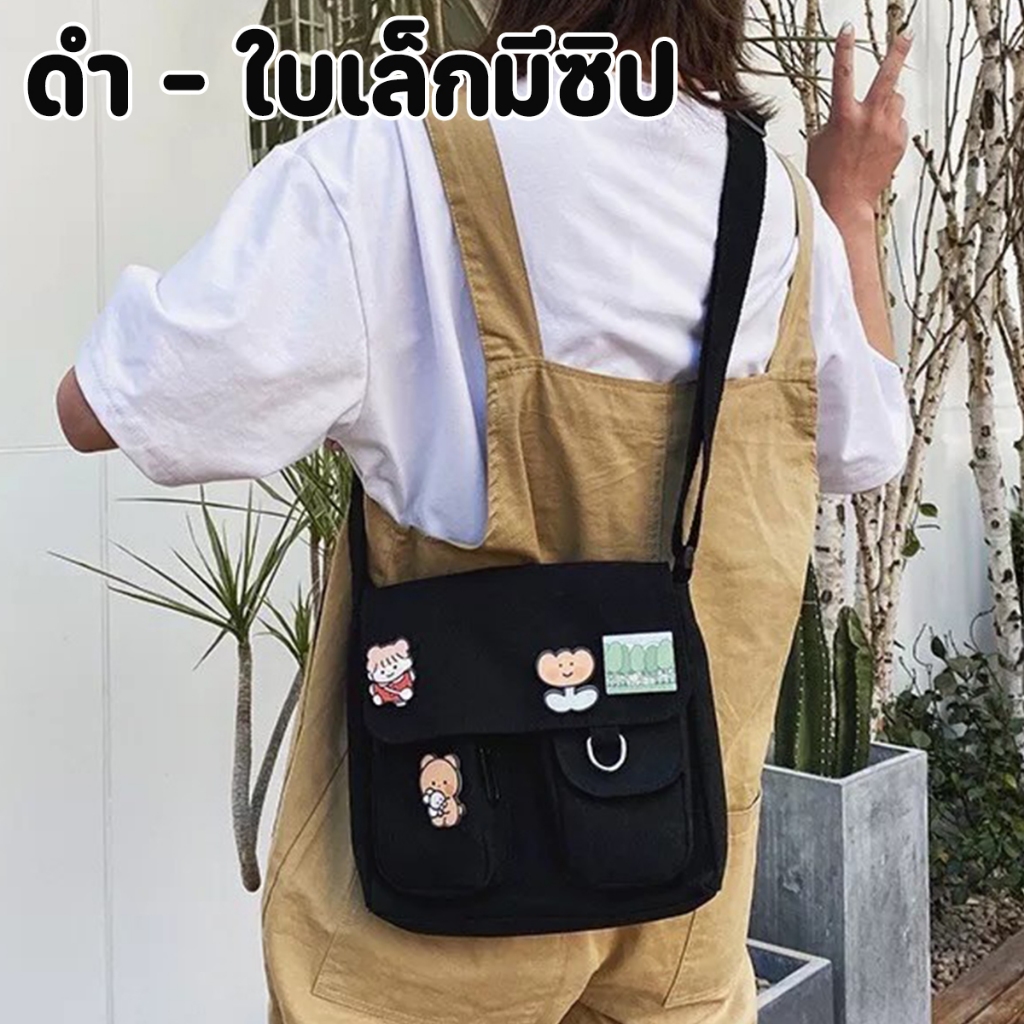 ส่งด่วน GUCSELECTED(B1409) กระเป๋าสะพายข้างผ้าแคนวาสพร้อมเข็มกลัด 4 ชิ้น มี2ไซส์สีดำ.สีขาว