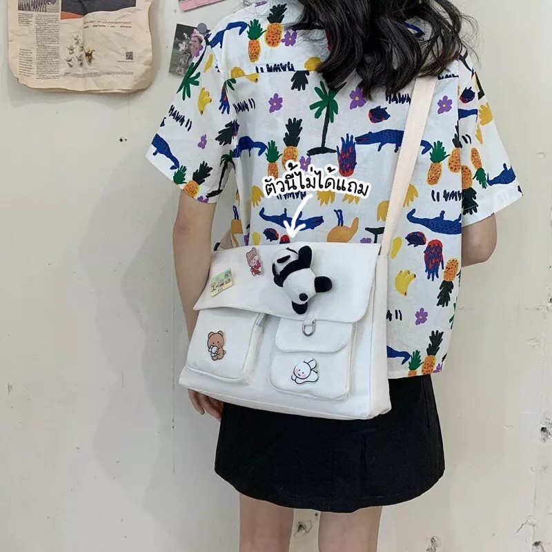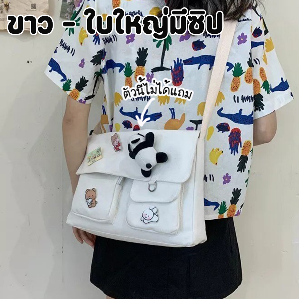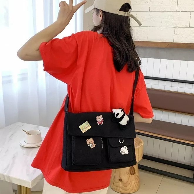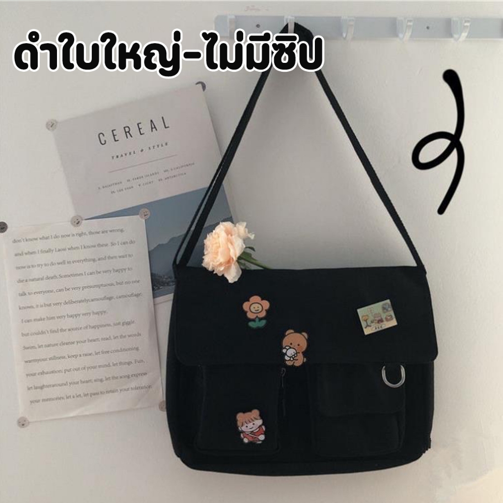 ส่งด่วน GUCSELECTED(B1409) กระเป๋าสะพายข้างผ้าแคนวาสพร้อมเข็มกลัด 4 ชิ้น มี2ไซส์สีดำ.สีขาว