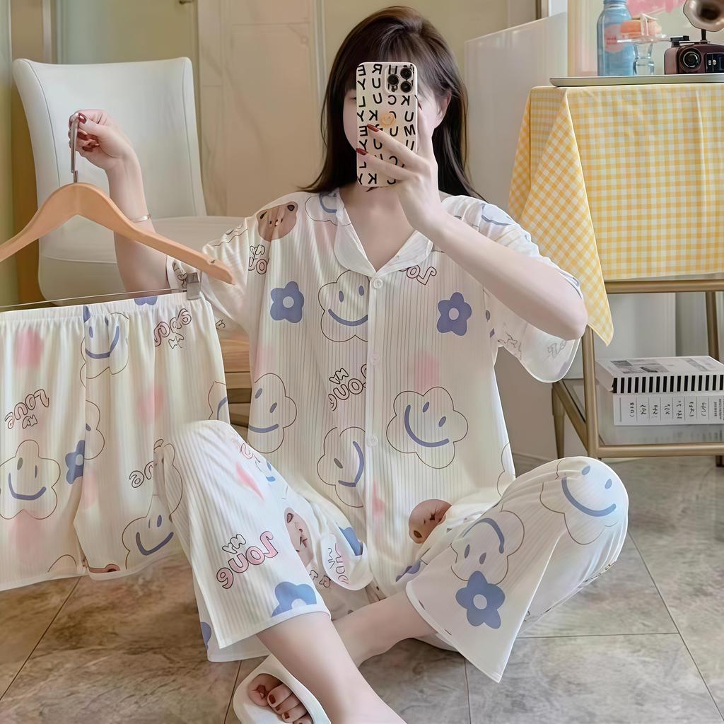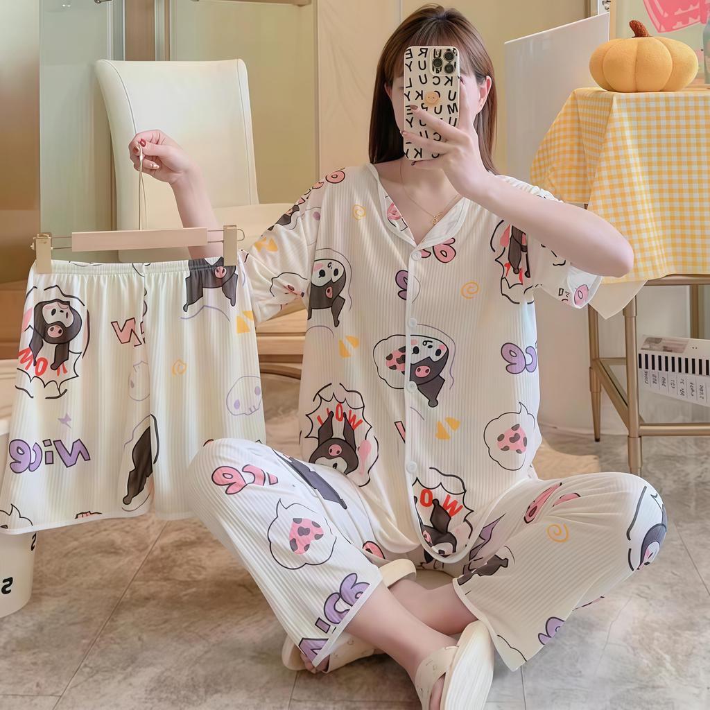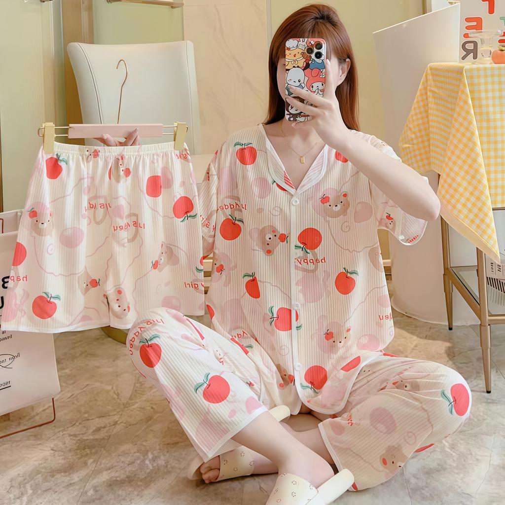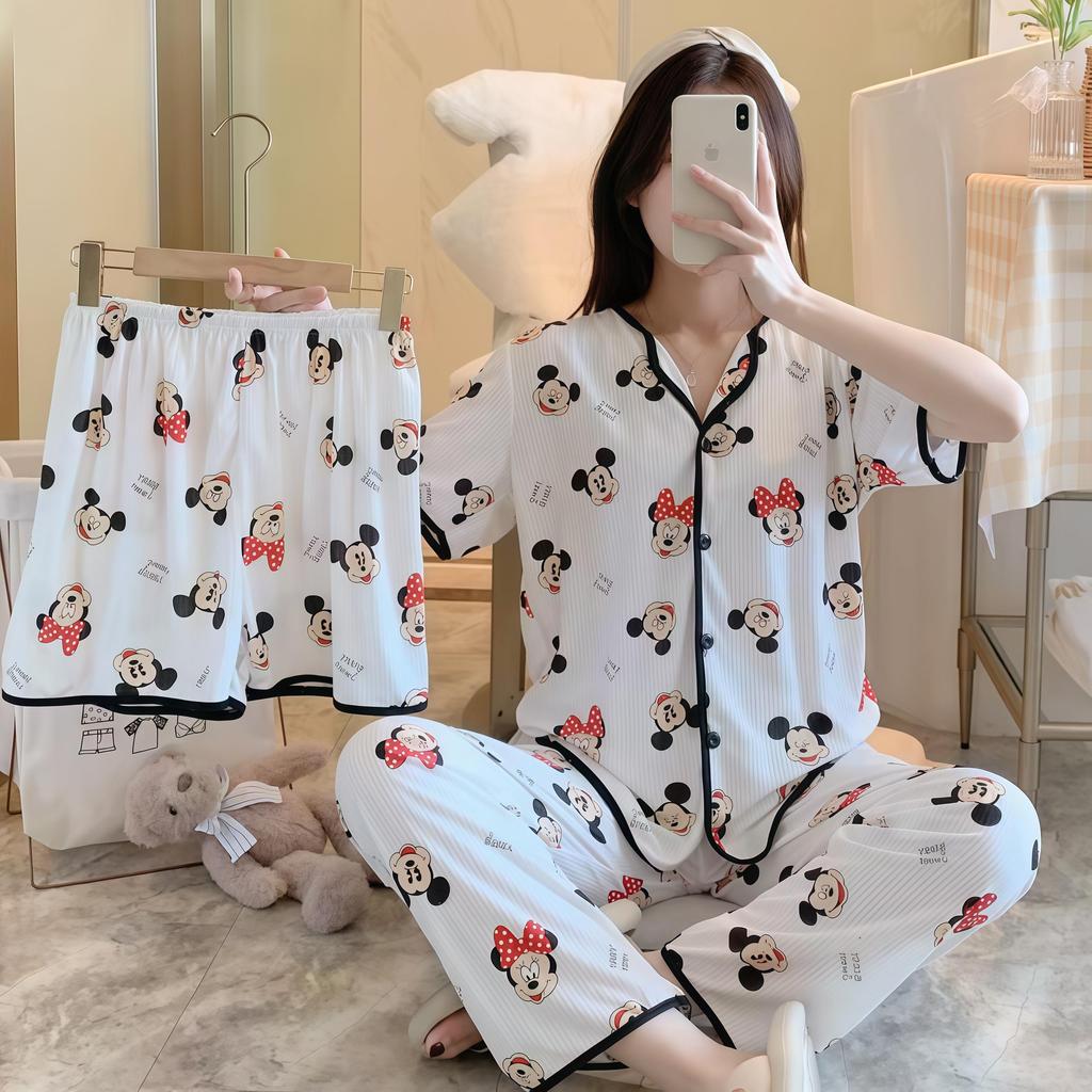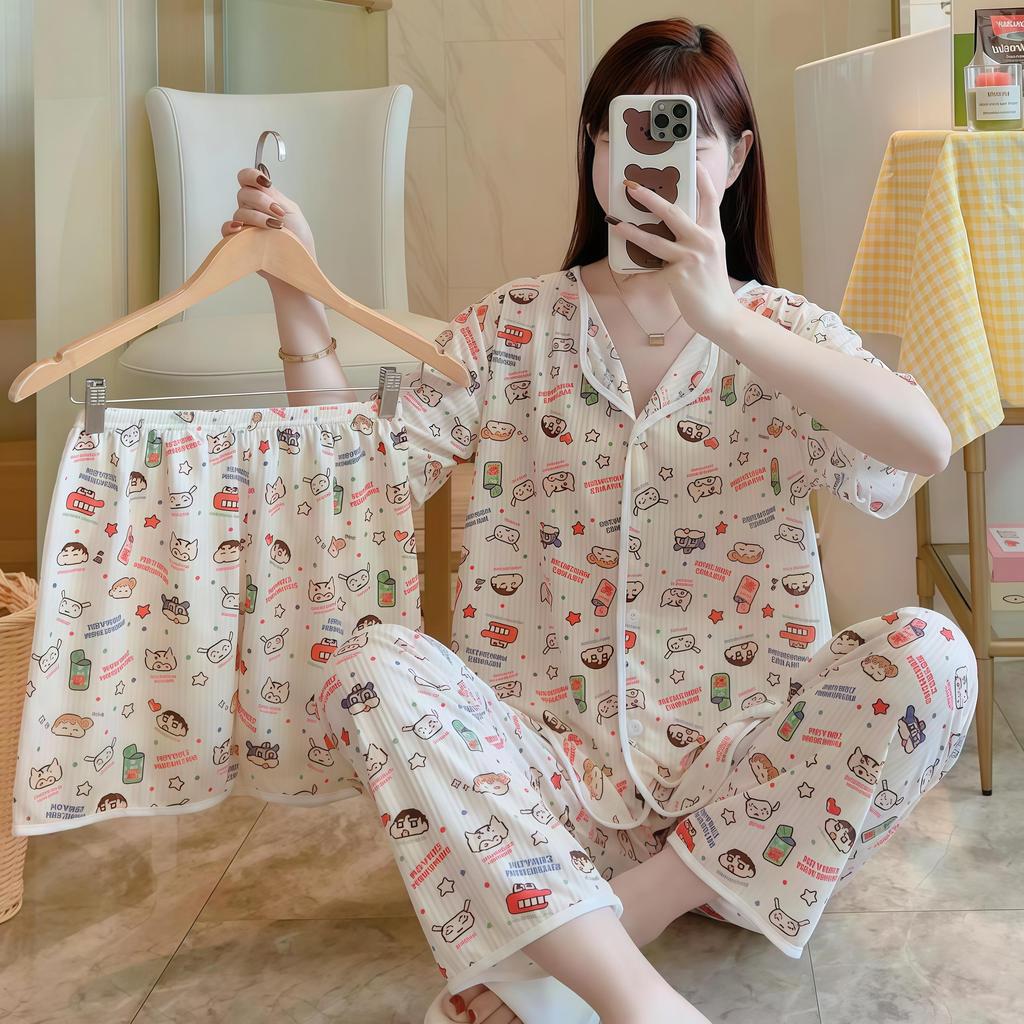 SLEEPWEAR FACTORY ชุดนอนสไตล์เกาหลี ชุดนอนผู้หญิงแขนสั้น ชุดเซ็ท3ชิ้นขายาว 🎳 ฟรีไซต์ อก38-44 นิ้ว W203