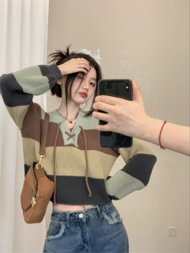 🎀Yummy Shop🎀พร้อมส่ง เสื้อไหมพรมคอวีแขนยาว ลายทางใหญ่ ทรงหลวม ผ้านิ่ม เสื้อแฟชั่นผู้หญิง สไตล์เกาหลี'56091-1