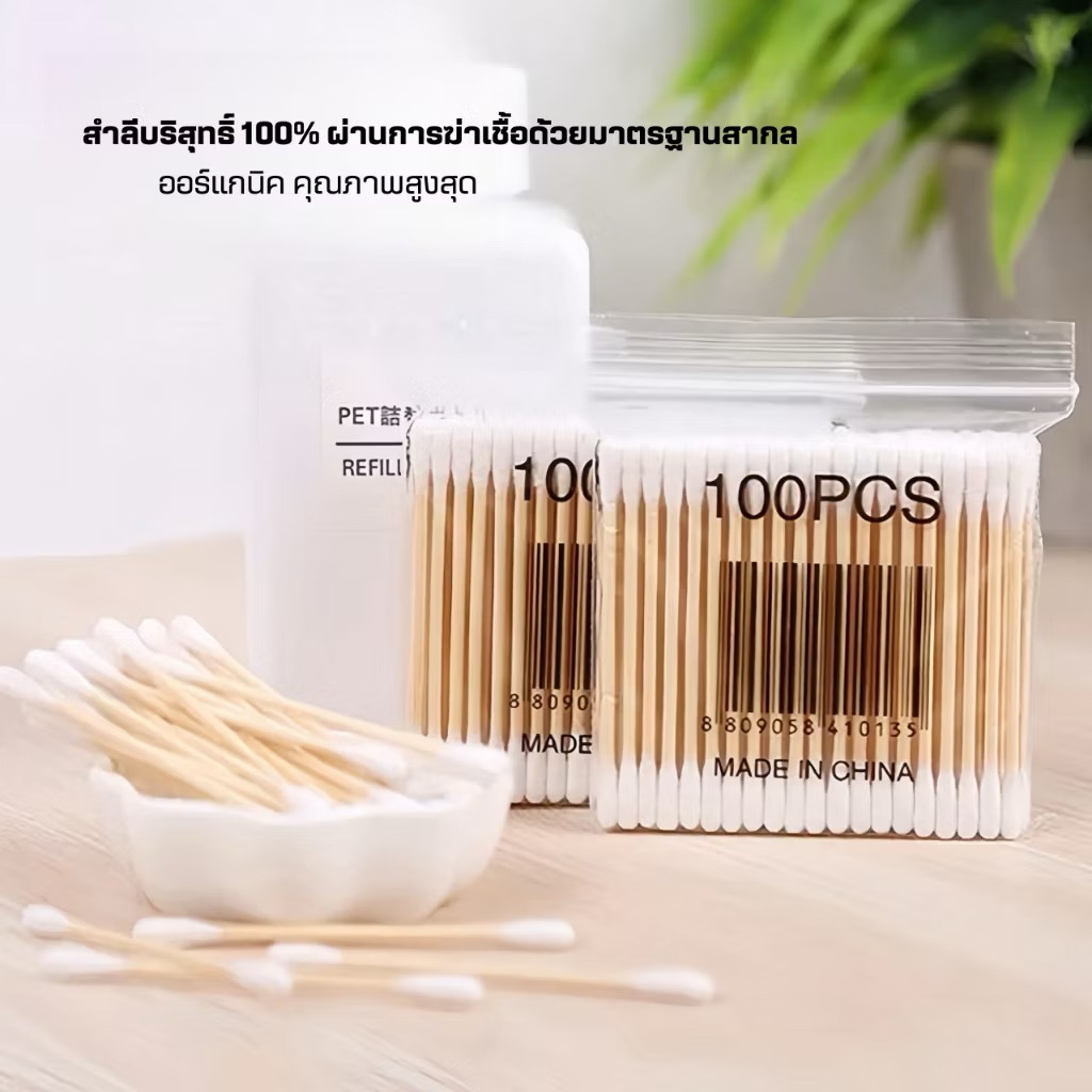 🌷Ayaya🌷สำลีก้าน ด้ามไม้ สองหัว ย่อยสลายได้ 100 ชิ้น Cotton Swab