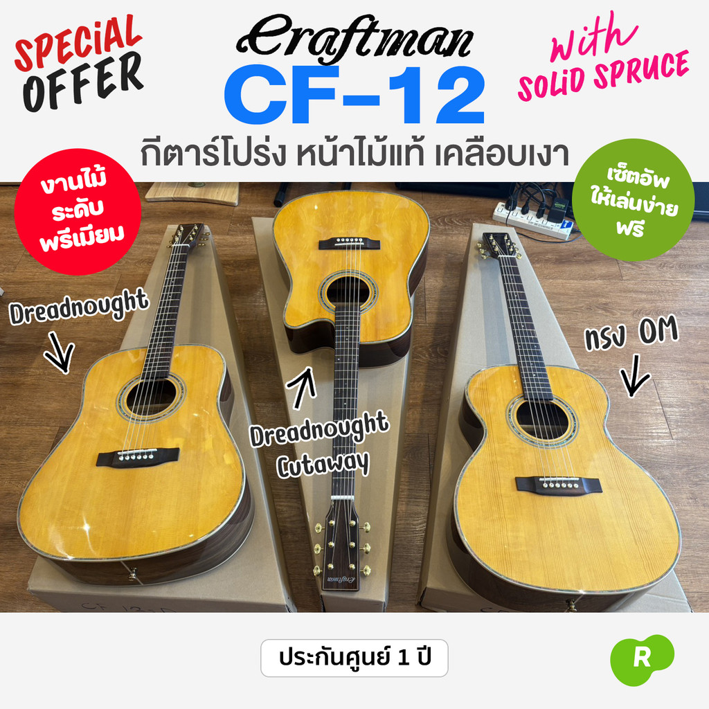 ⭐เซ็พอัพฟรี⭐ Craftman CF-12 กีตาร์โปร่ง 41 นิ้ว ทรง Dreadnought /OM โซลิดสปรูซ เคลือบเงา เกรดพรีเมียม