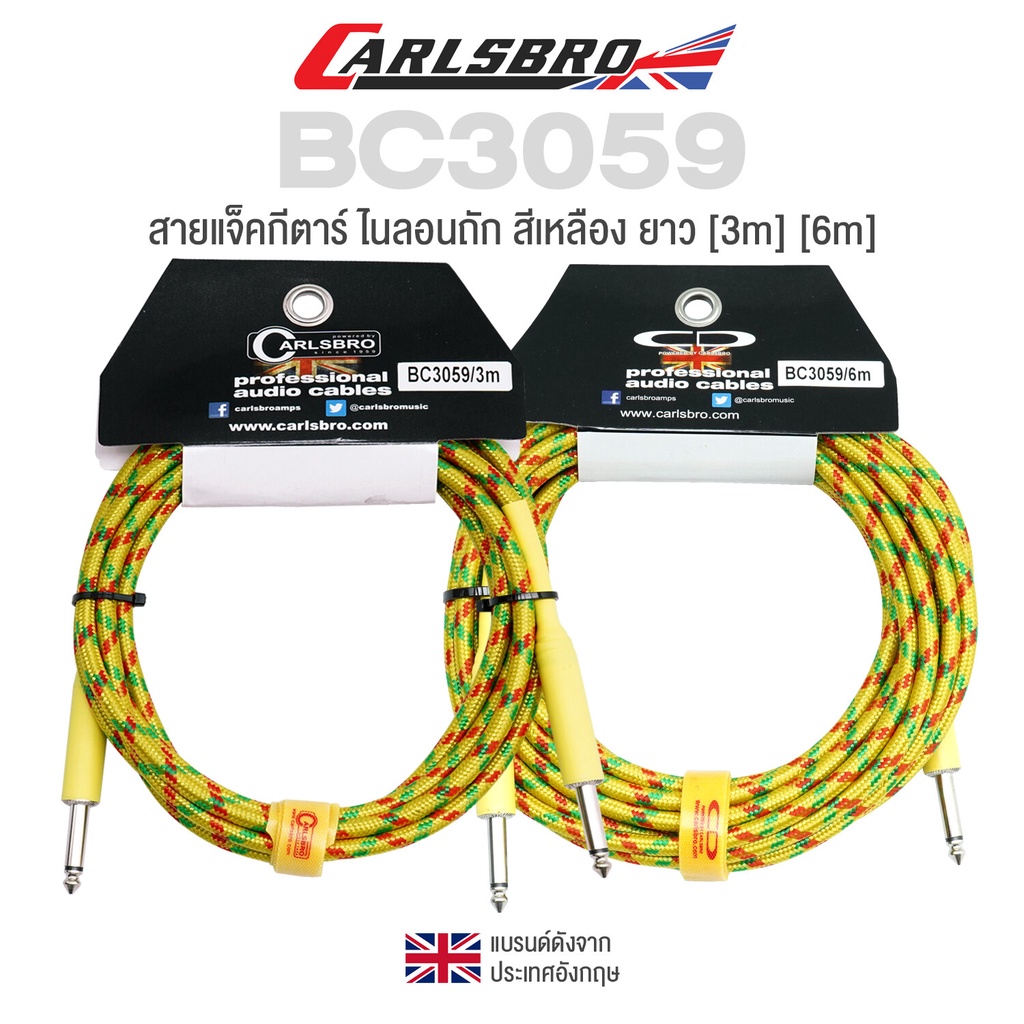 Carlsbro BC3059 Braided Instrument Cable สายแจ็คกีตาร์ ยาว [3m] [6m] แบบไนลอนถัก สายไม่พัน สีเหลือง + แถมฟรีที่รัด ** แบ
