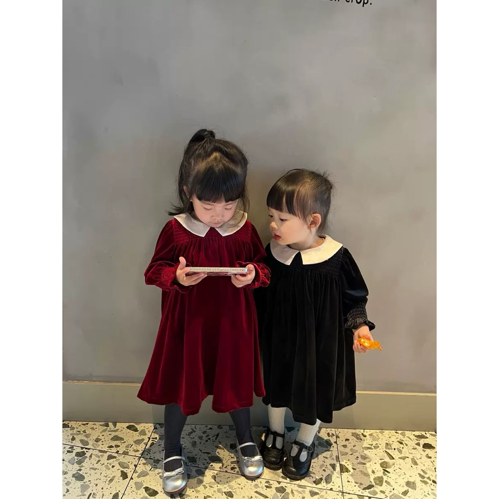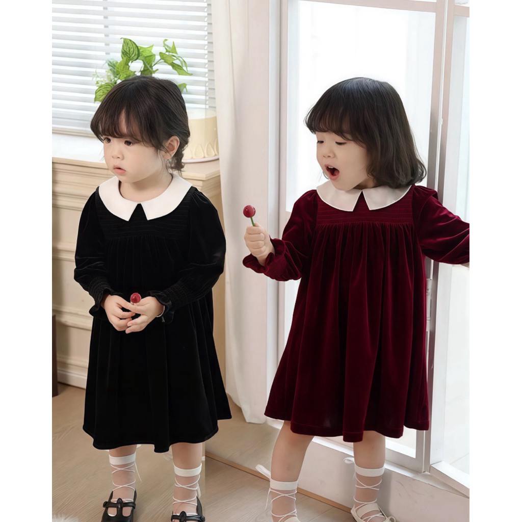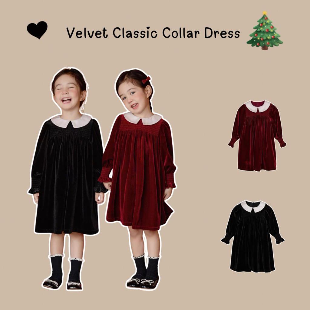 🇹🇭พร้อมส่งจากไทย🇹🇭 ชุดเดรสกำมะหยี่คอปก เดรสสีแดงสำหรับเด็ก เดรสสีดำสำหรับเด็ก ชุดคริสมาสเด็ก