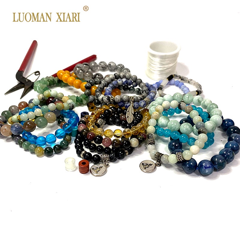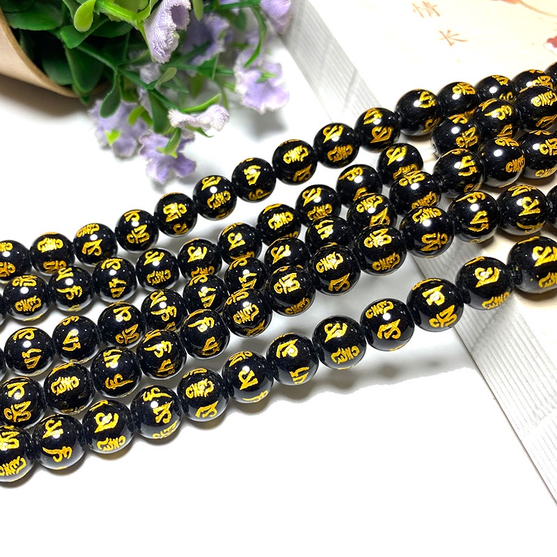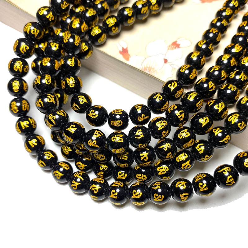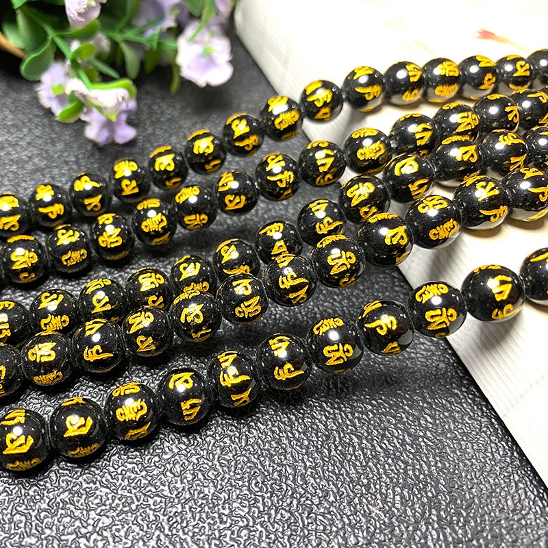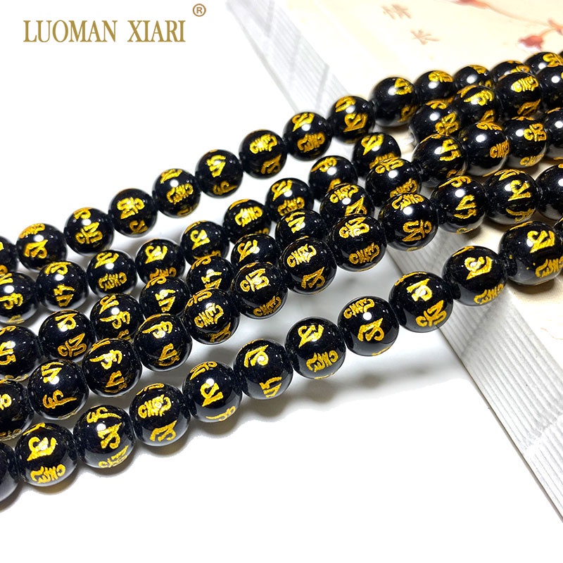 LUOMAN XIARI Spot Six Word Mantra Black Agate ธรรมชาติหลวมรอบหินลูกปัดสําหรับเครื่องป ระดับทํา DIY สร้อยคอสร้อยข้อมือ 6/8/10/12/14 มม.ประมาณ 36-38 ซม.