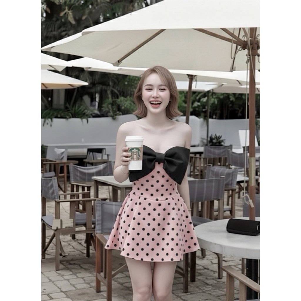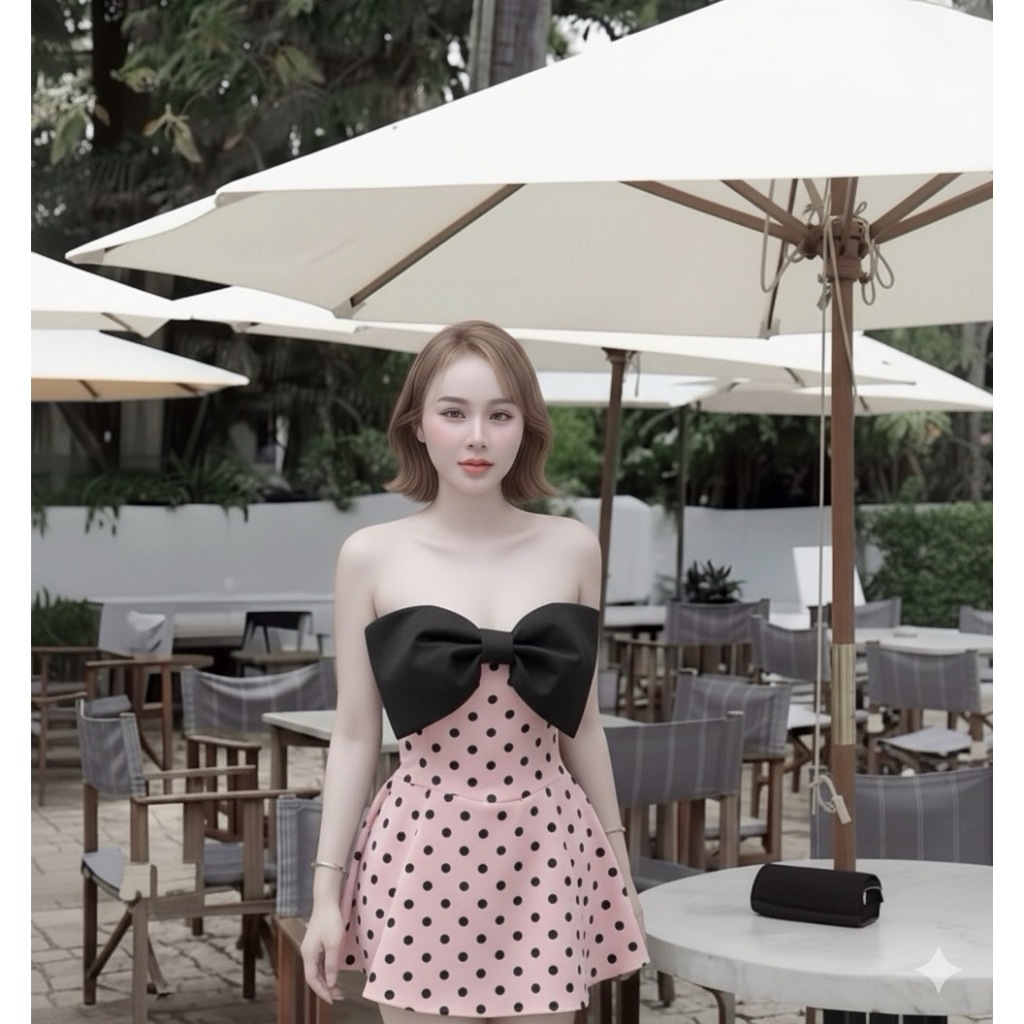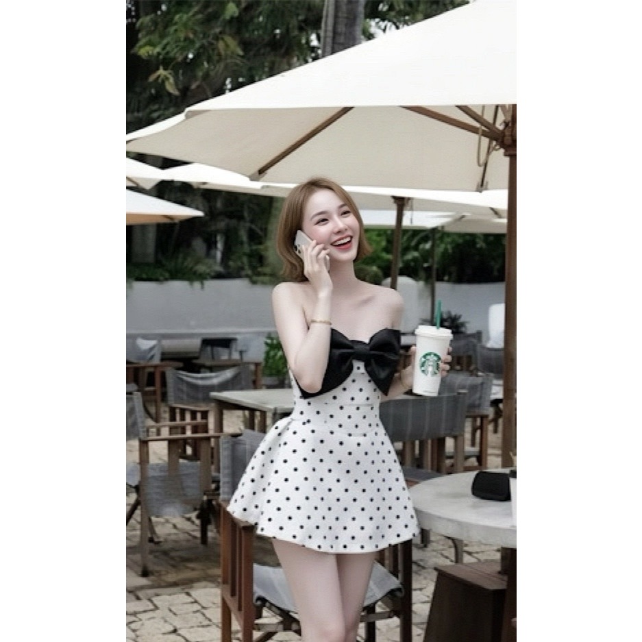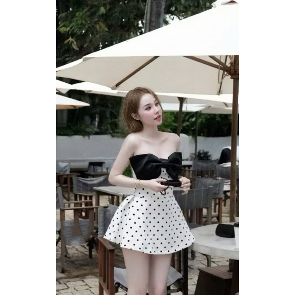 SET-133 ชุดโบว์โพกาดอท ชุดเซ็ต 2 ชิ้น เกาะอกโบว์ยักษ์ น่ารักมาก